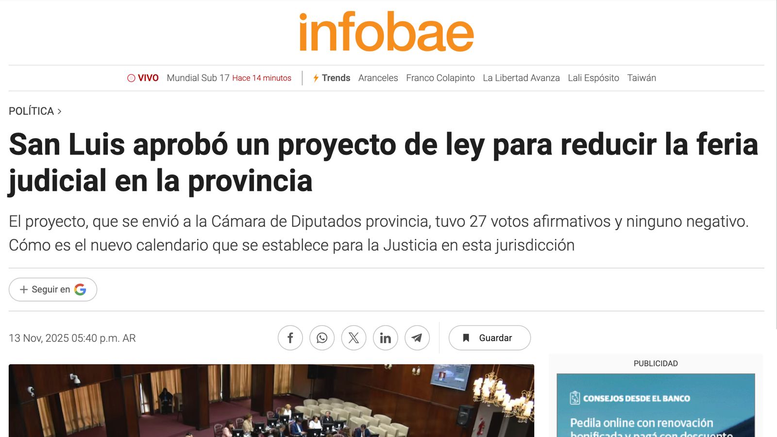 Infobae tituló: ‘San Luis aprobó un proyecto de ley para reducir la feria judicial en la provincia’. En el texto, destacaron: “Uno de los aspectos centrales del proyecto se vincula con el actual esquema de ferias y recesos, señalado por distintos sectores como un obstáculo para la eficacia y el acceso a la Justicia. Hasta ahora, los extensos períodos de paralización de la actividad judicial, sumados a la inactividad durante los fines de semana y los días considerados festivos, generaban acumulación de expedientes y demoras en la tramitación de causas”.