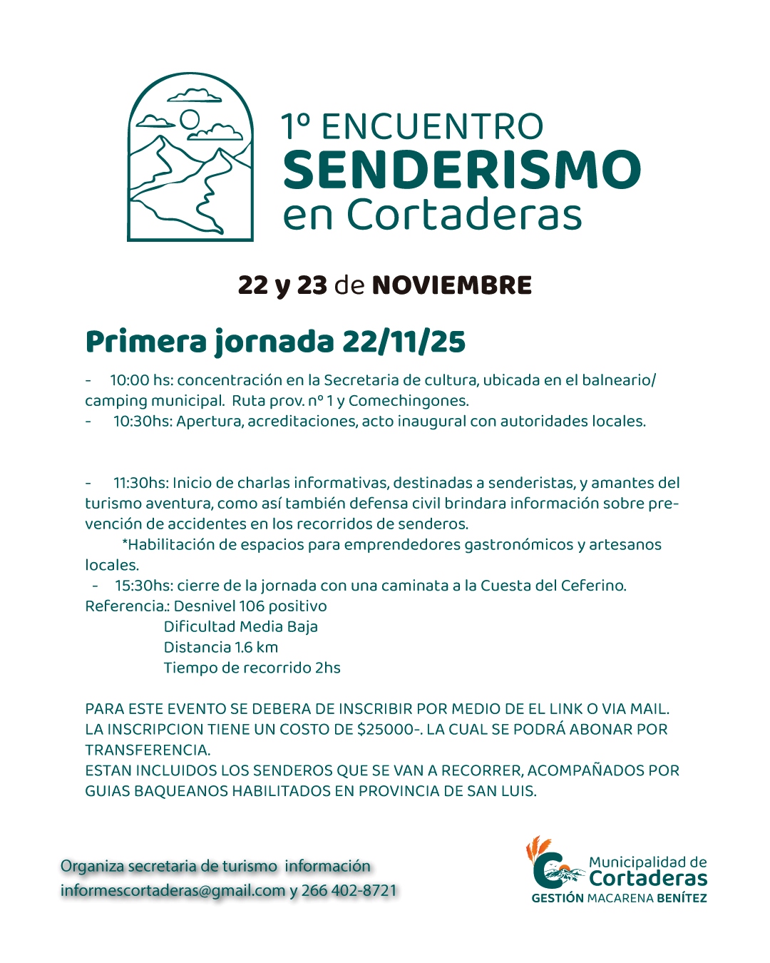 El 1° Encuentro de Senderismo, que se realizará el sábado 22 y domingo 23 de noviembre, es una propuesta que invita a vecinos, turistas y amantes de la naturaleza a disfrutar de dos jornadas dedicadas al turismo aventura, la actividad física y el descubrimiento de los paisajes serranos de la región.