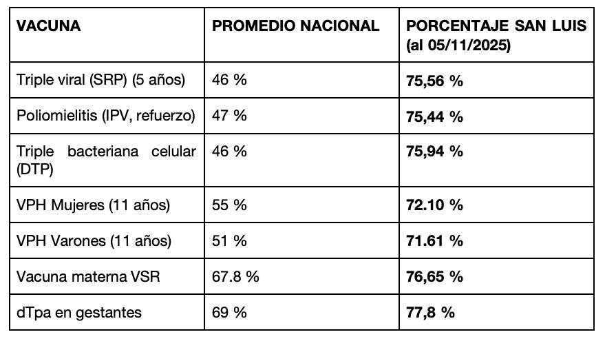 San Luis alcanza coberturas destacadas en todas las vacunas críticas del calendario