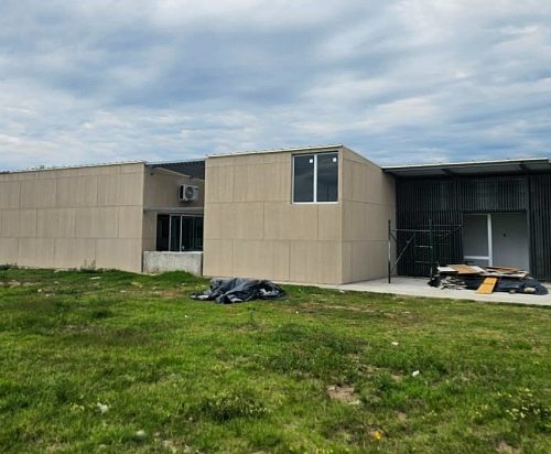 La dirección de Obras de Arquitectura y Viviendas informó que el avance general es del 80%. La estructura principal está completa, con los volúmenes exteriores definidos y cerrados. Las fachadas se encuentran terminadas, con panelería colocada y aberturas instaladas. Actualmente, se realizan ajustes en el entramado metálico parasol del ingreso principal y se trabaja en la colocación del revestimiento plástico con color.