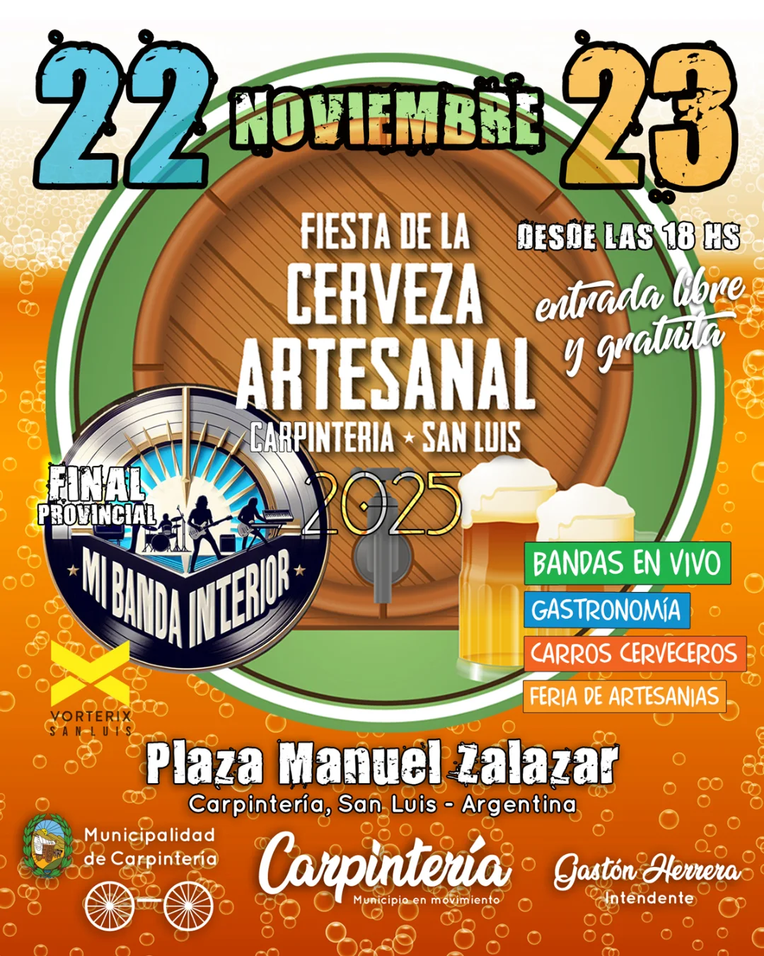 El fin de semana largo, la plaza Manuel Zalazar de Carpintería será escenario de un encuentro con música en vivo, carros cerveceros, gastronomía regional y feria de emprendedores, con la Fiesta de la Cerveza Artesanal 2025, que cada año convoca a miles de visitantes.