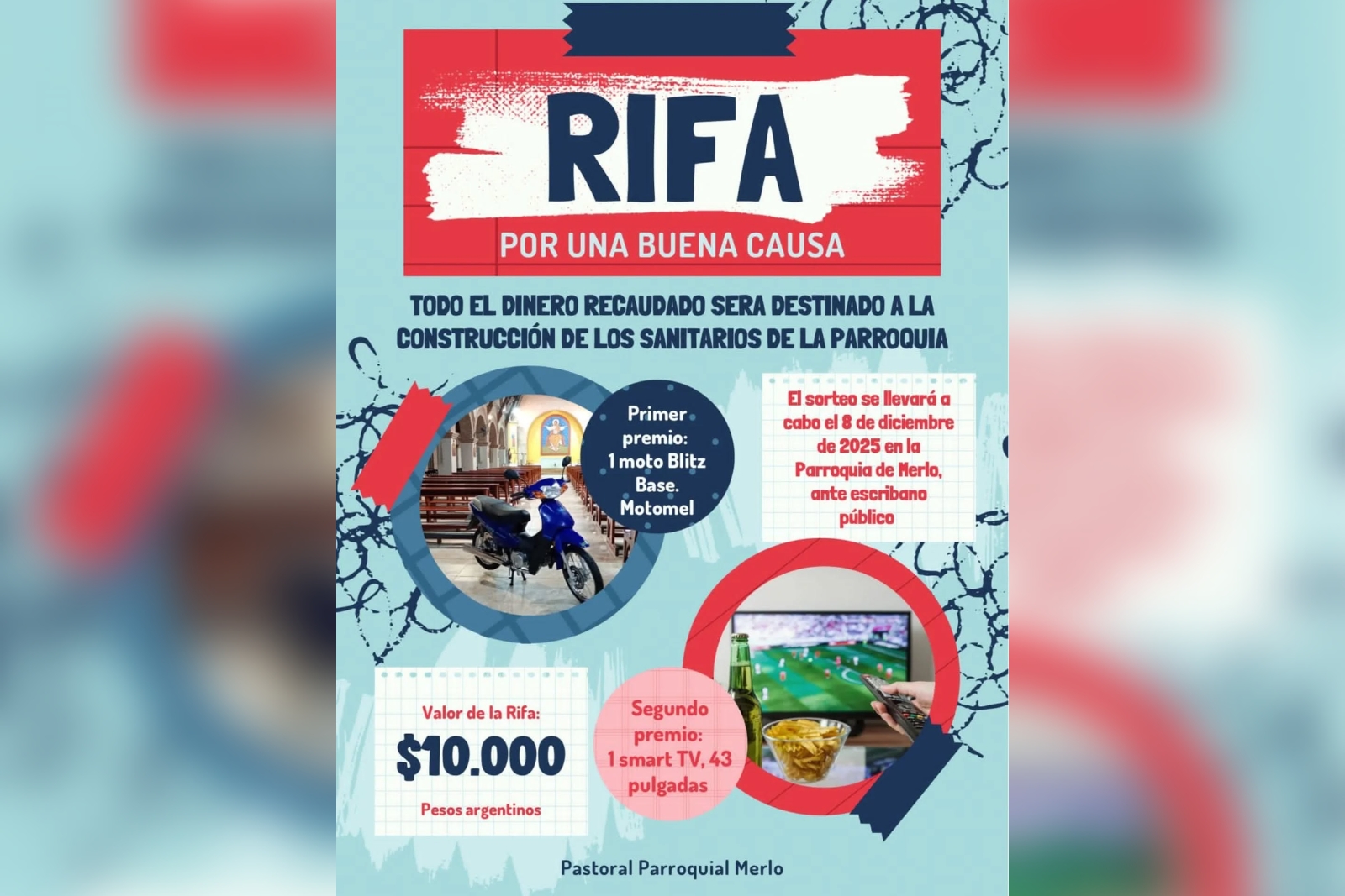 El 1° premio es una moto Blitz Base Motomel, y el 2° premio es un smart TV 43 pulgadas. El valor del número es de $10.000. El sorteo se realizará el mismo 8 de diciembre, ante escribano público. Según informaron los organizadores, los números se pueden adquirir en la secretaría parroquial, la santería o con voluntarios habilitados de la iglesia.