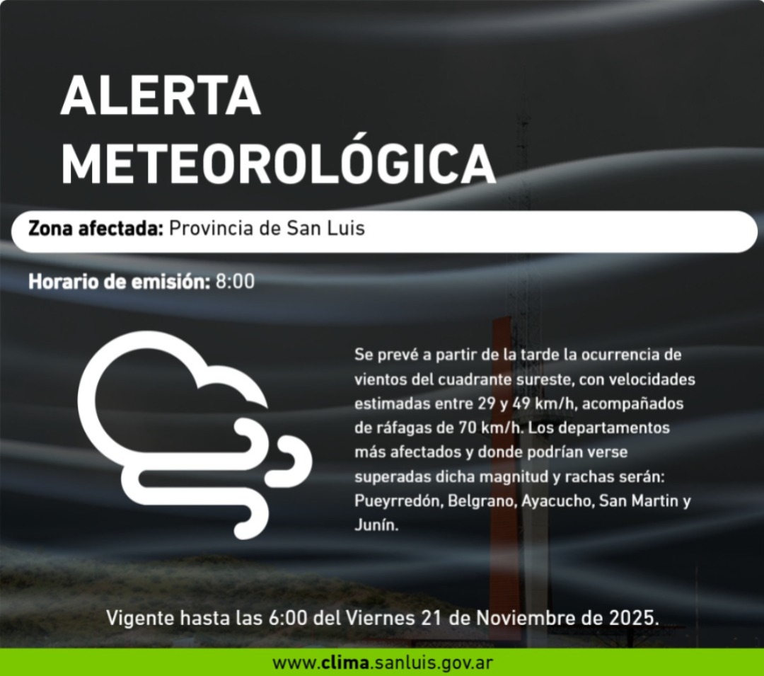 San Luis tendrá este jueves un día marcado por el calor, la inestabilidad y el viento. Según informó la Red de Estaciones Meteorológicas (REM), luego de un amanecer templado, se espera una tarde calurosa y la presencia de ráfagas intensas que motivaron la emisión de una alerta meteorológica para toda la provincia, vigente hasta las 6:00 del viernes 21.