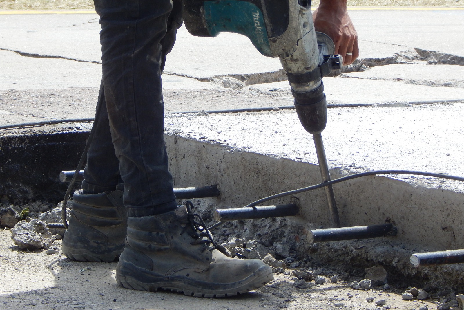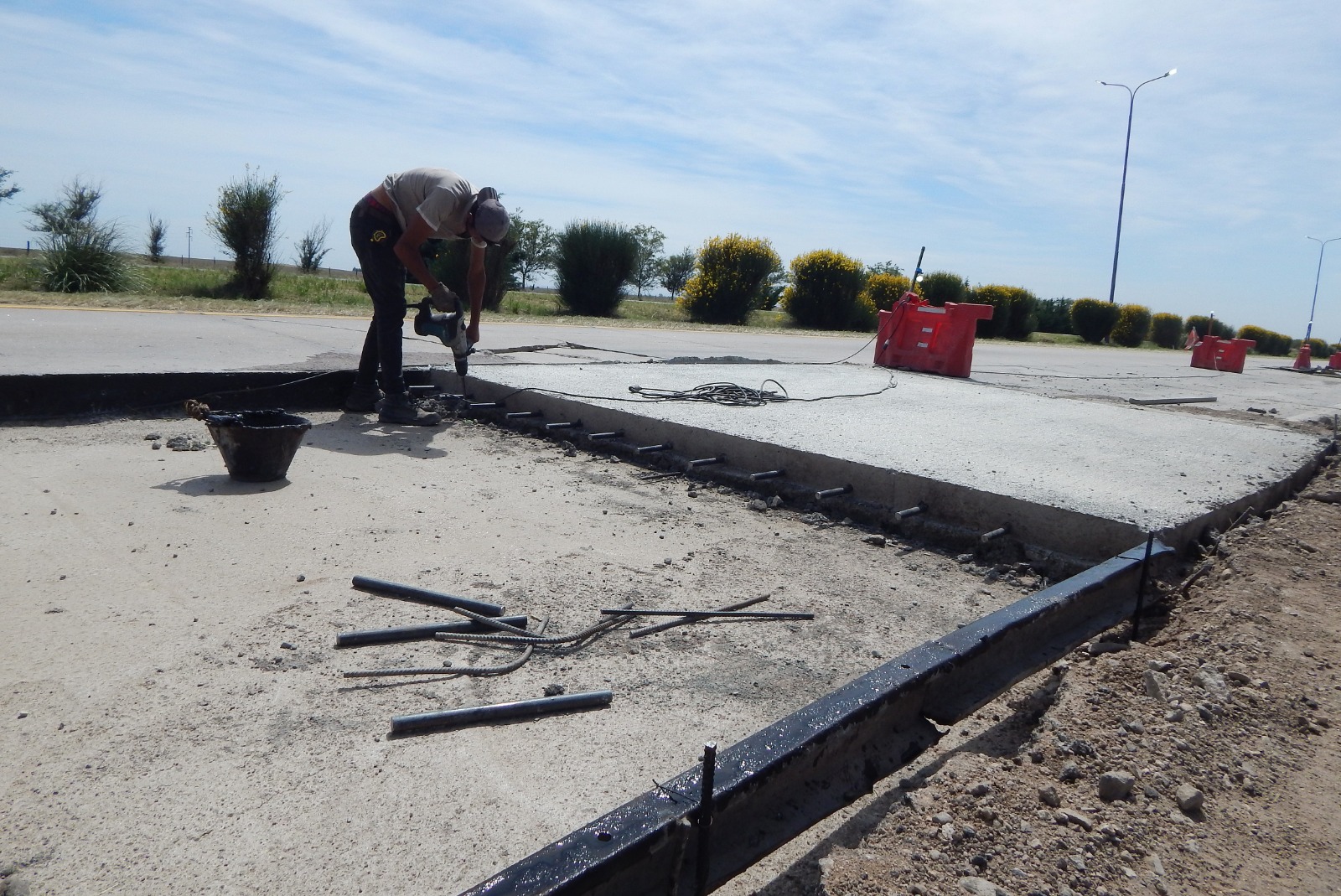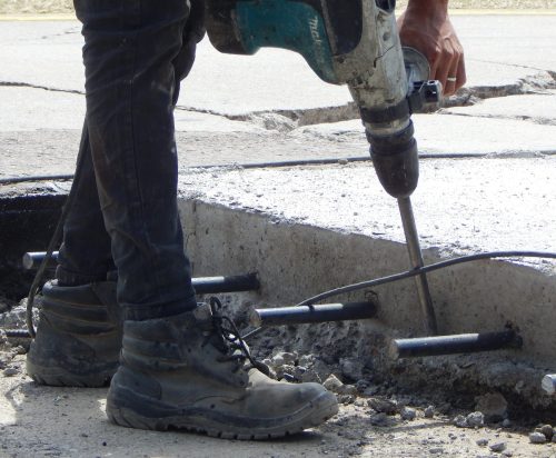 Cada abordaje incluye la demolición y retiro del pavimento dañado, trabajos que requieren maquinaria pesada para remover el material y preparar la base. Además, el personal realiza perforaciones en los bordes de las losas para la colocación de barras metálicas que aseguran la correcta vinculación estructural con las nuevas placas de hormigón, entre otras tareas previas al nuevo hormigonado que permite reemplazar las losas deterioradas.