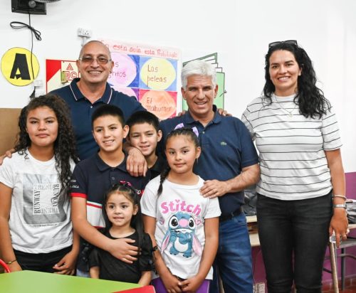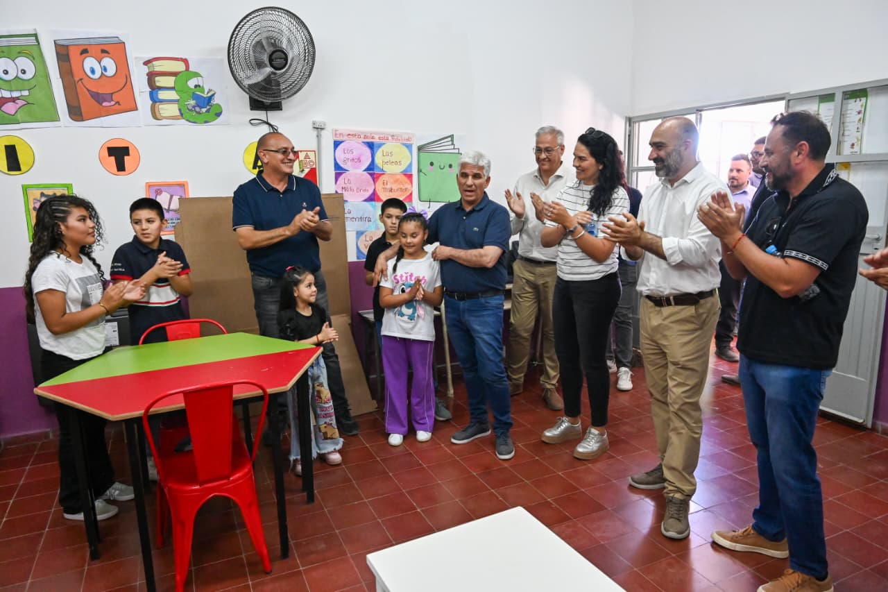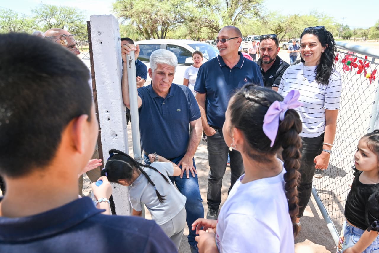 La escuela rural N°290 Teófilo Gatica recibió la visita del gobernador Claudio Poggi y fue todo un acontecimiento. Ubicada a 300 metros del pozo público recién inaugurado en el paraje Pampa Grande, tuvo un mediodía distinto.