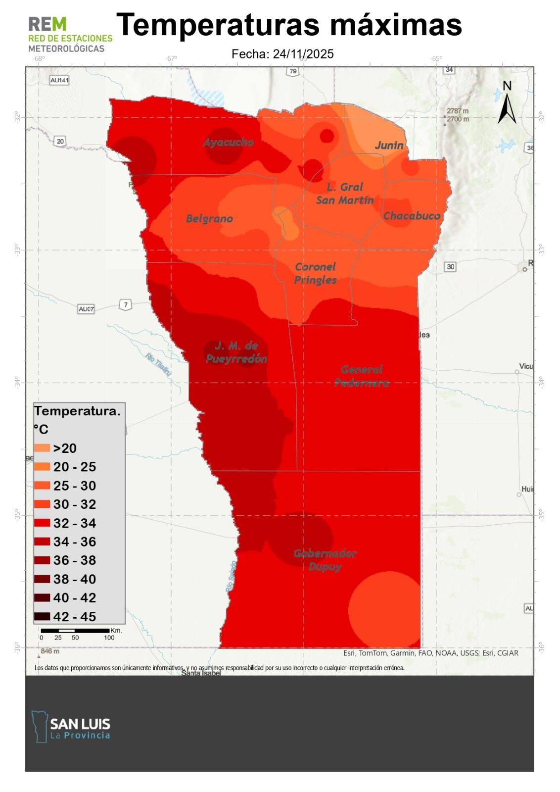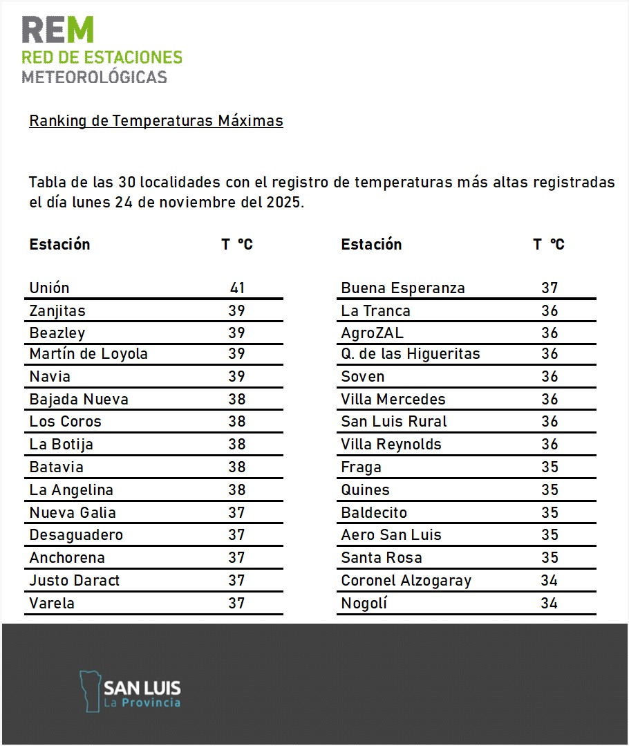 Este lunes, la Red de Estaciones Meteorológicas (REM) publicó un informe especial en el que advierte que esta semana continuará “el ascenso de las temperaturas provinciales, superando valores normales para el mes de noviembre, dando lugar a una posible ola de calor”. El último día del feriado largo, Zanjitas y Beazley marcaron térmicas de 41º y 39º, mientras que este martes la máxima podría superar los 37º en gran parte del territorio.