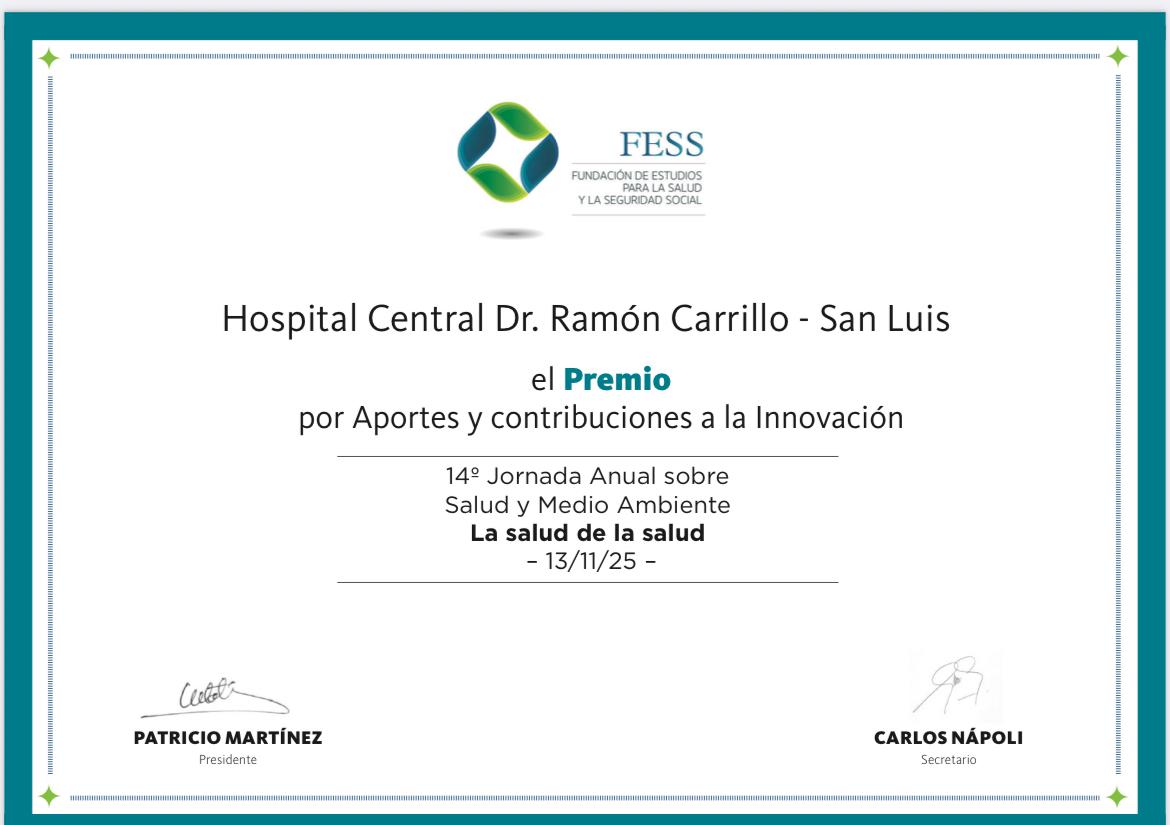 El Hospital Central ‘Dr. Ramón Carrillo’ fue distinguido con el Premio Institucional FESS en la categoría Innovación, un reconocimiento que destaca el trabajo realizado por la institución en los últimos dos años en materia de gestión, tecnología y desarrollo de capacidades.