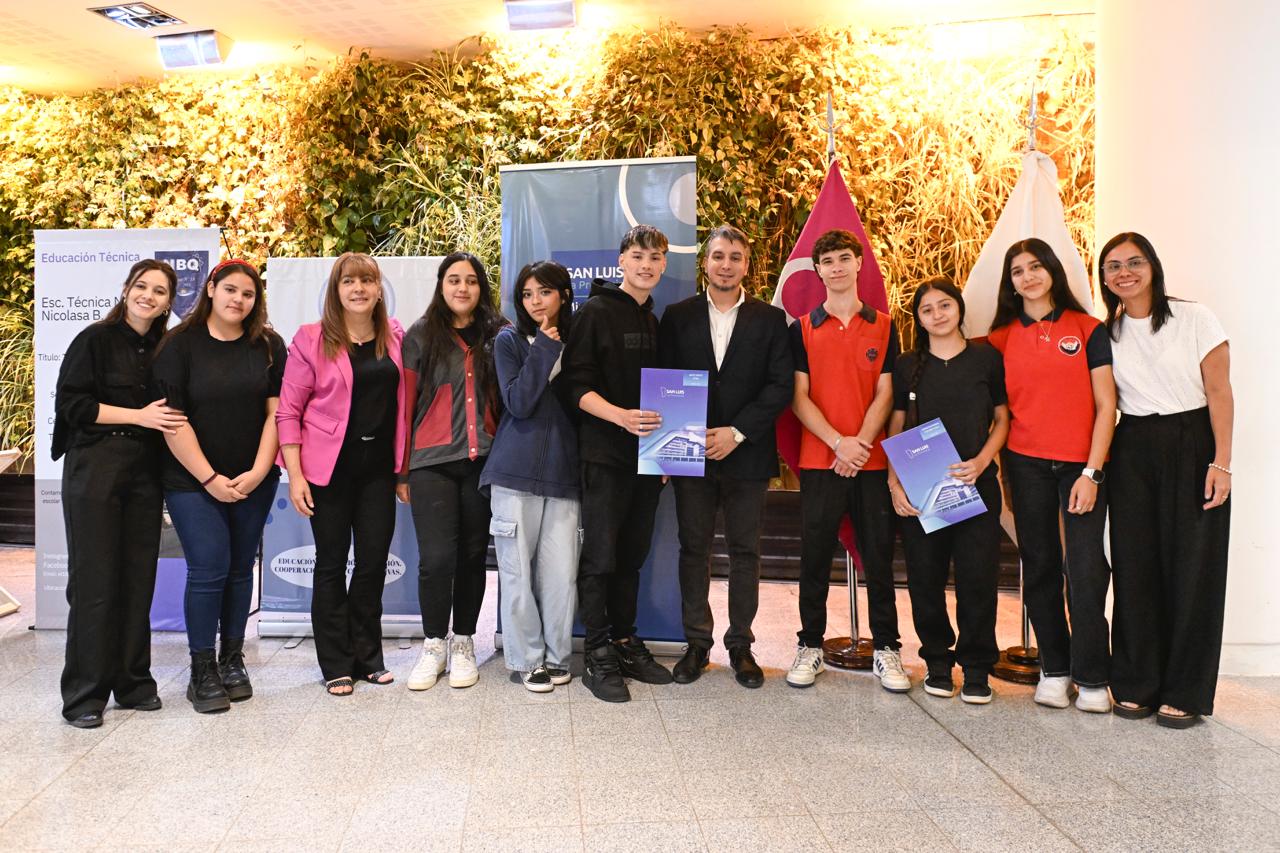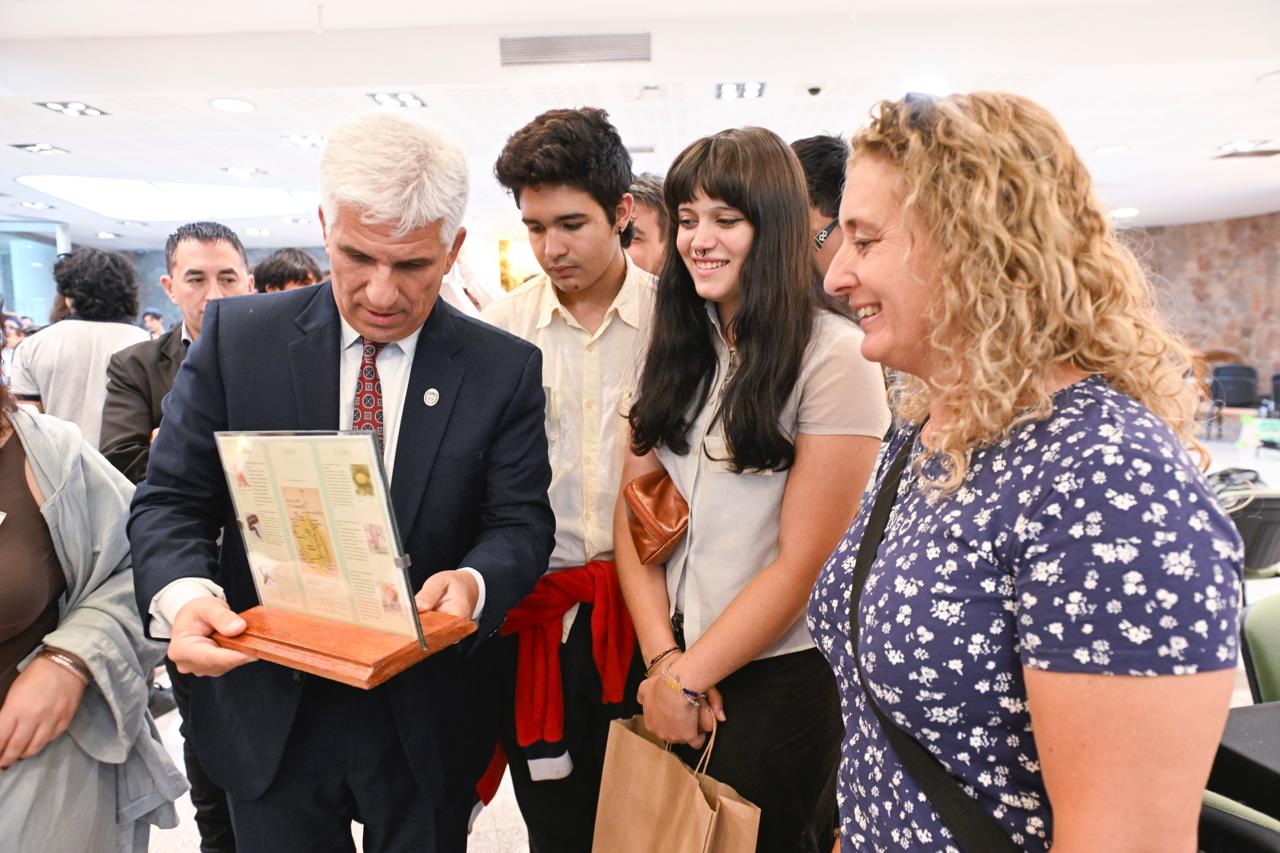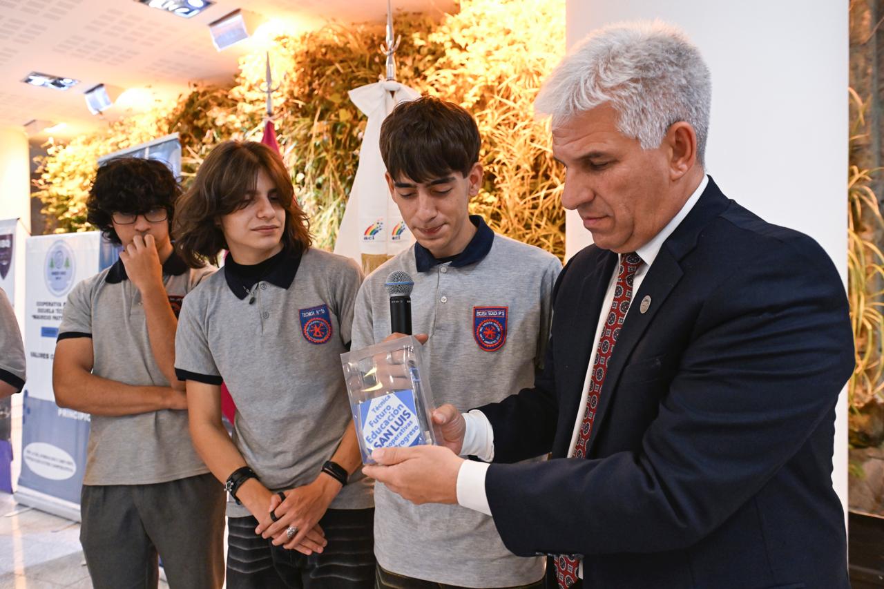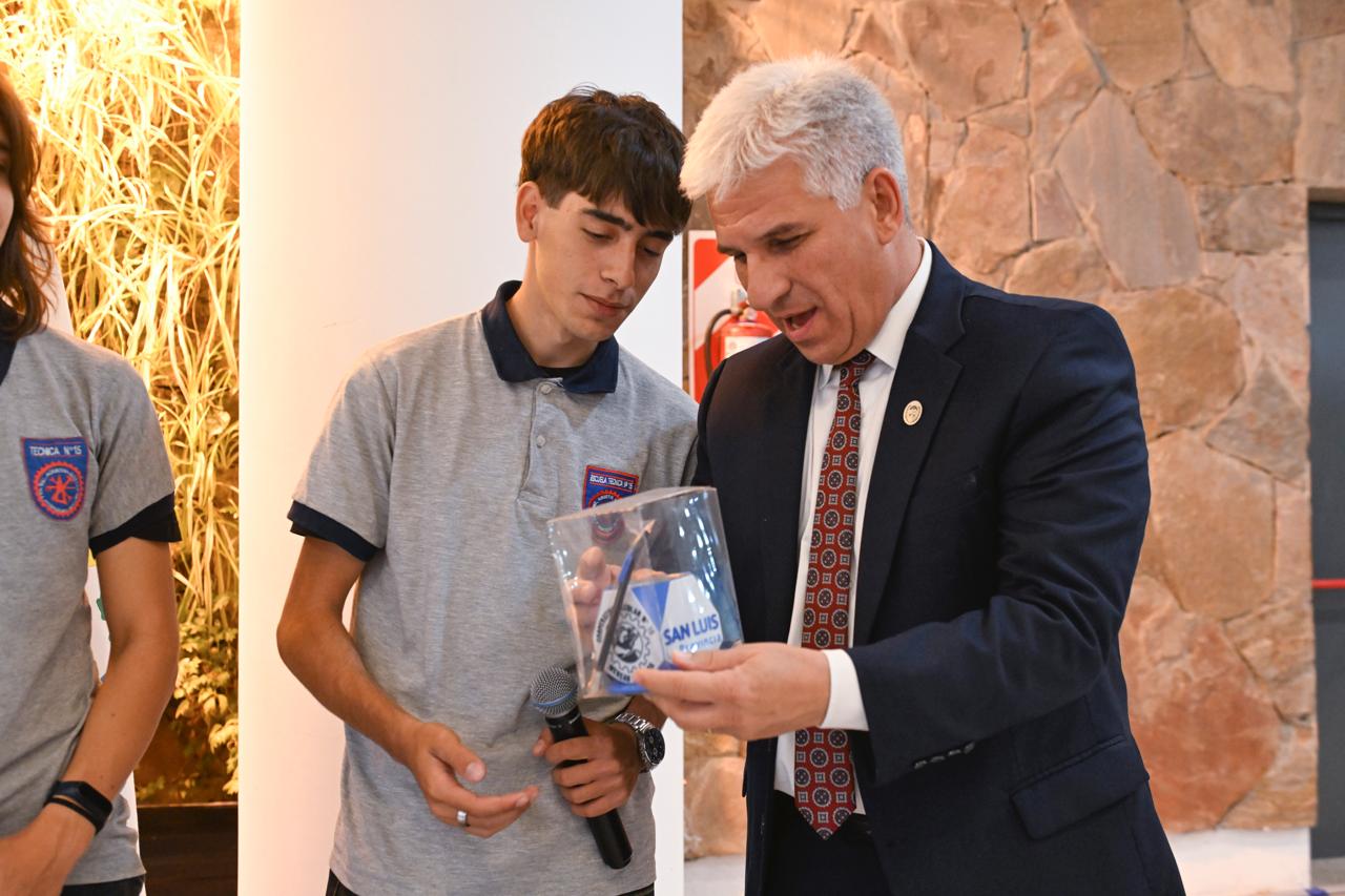 Luego, los alumnos de cada una de las cooperativas escolares tomó el micrófono y detallaron las actividades que realizan en sus instituciones. Los representantes de la Escuela Técnica N°15 ‘Ingeniero Agustín Mercau’ de Villa Mercedes, además, le regalaron al Mandatario un mate impreso en 3D.