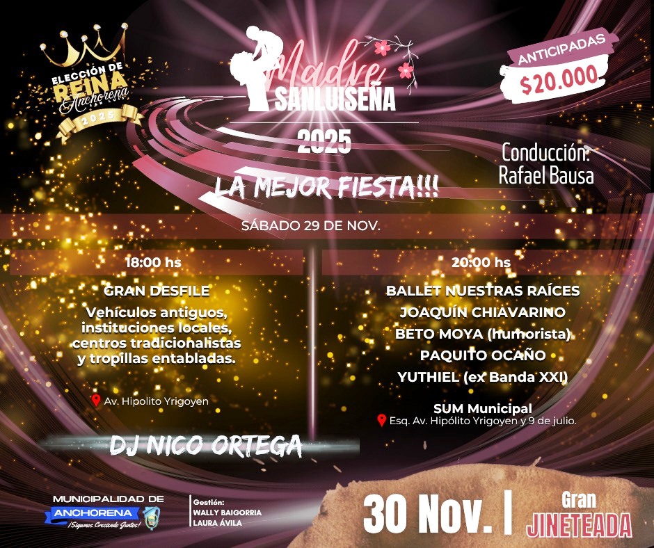 La Fiesta de la Madre Sanluiseña tendrá dos jornadas, el sábado 29 y domingo 30 de noviembre, cargadas de propuestas para toda la familia. Organizada por la municipalidad de Anchorena, la fiesta reafirma sus raíces, celebra la figura de la mujer sanluiseña y proyecta a la localidad como un destino atractivo para visitantes de toda la región.