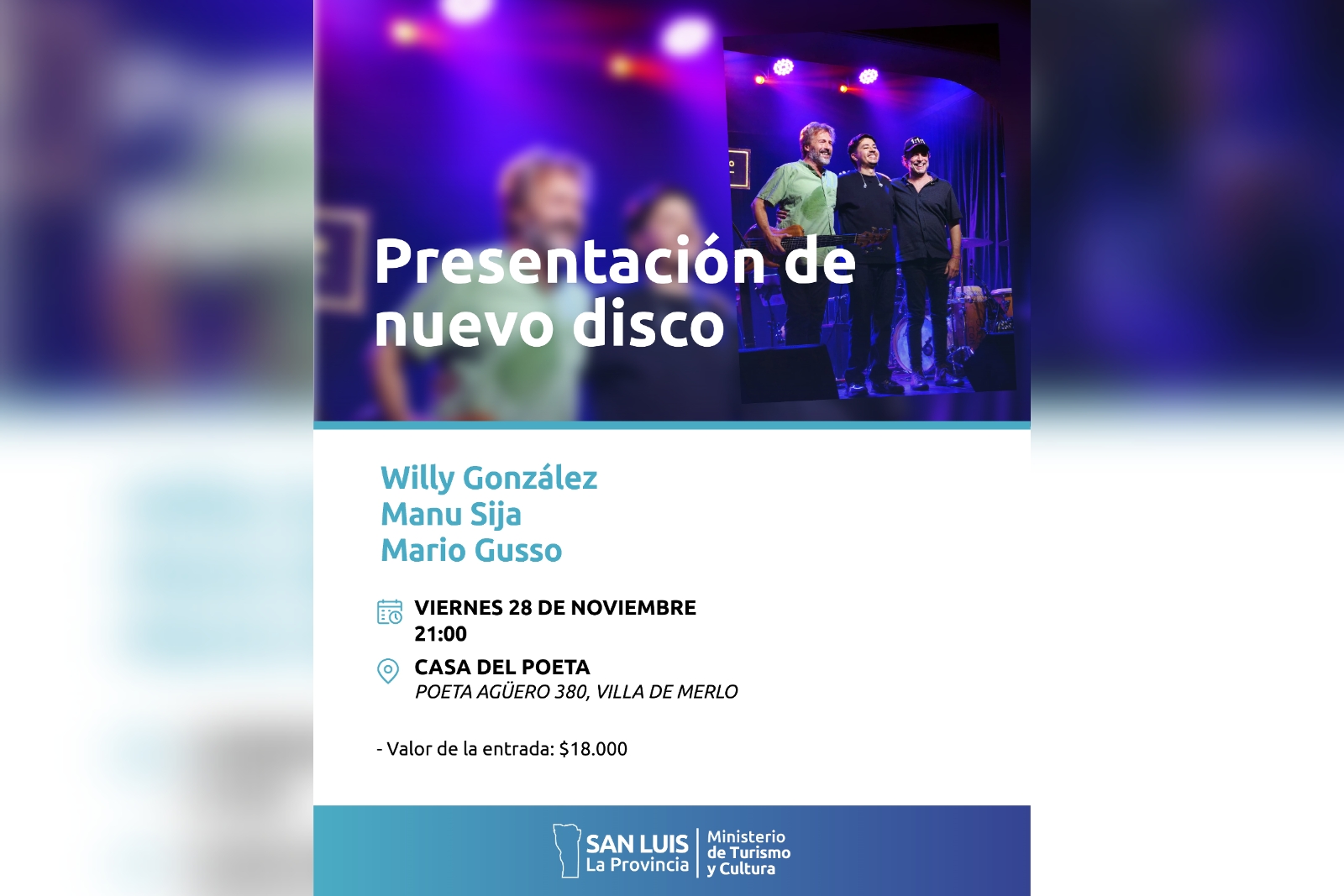 El trío artístico conformado por Willy González, Manu Sija y Mario Gusso se presentará este viernes 28, a las 21:00, en el espacio cultural merlino. El show combinará folklore, jazz y música contemporánea.