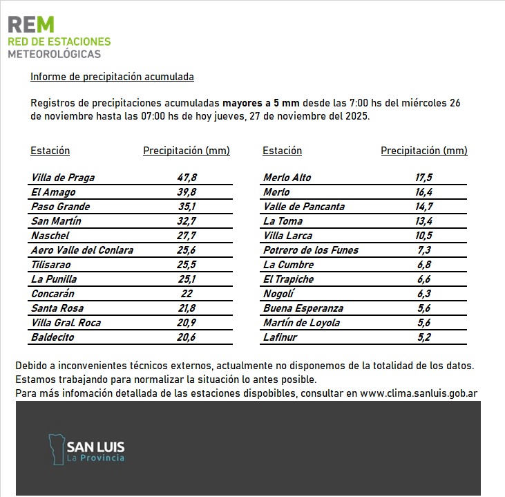 “Este jueves se espera una jornada con comienzo inestable y con leve descenso de temperaturas. El cielo estará parcialmente nublado con lluvias y tormentas de variada intensidad por la madrugada. Desde el amanecer se reducirá la inestabilidad y el cielo estará mayormente despejado posteriormente”, publicó esta mañana la Red de Estaciones Meteorológicas (REM) de San Luis.