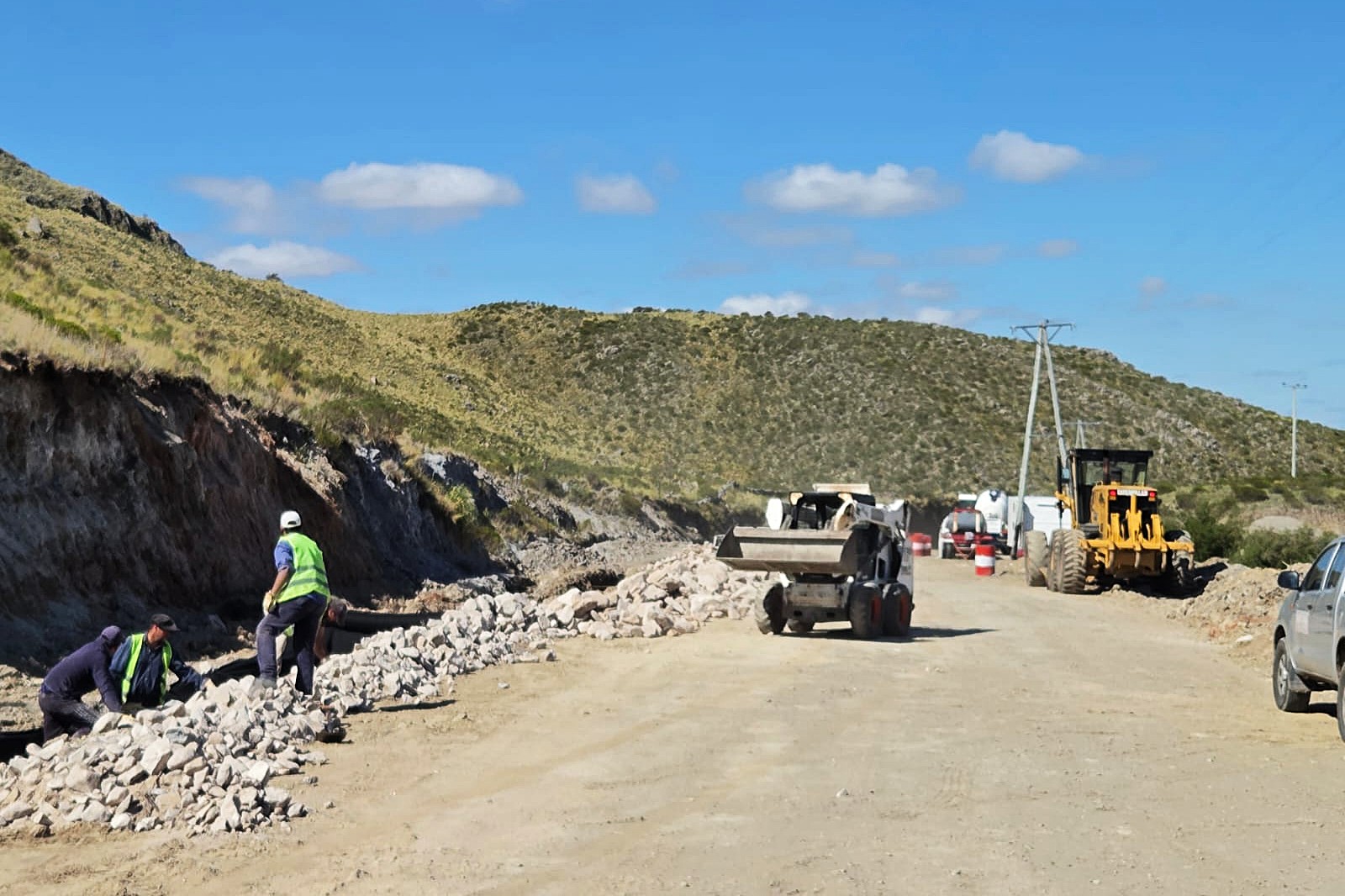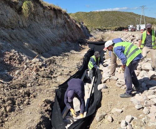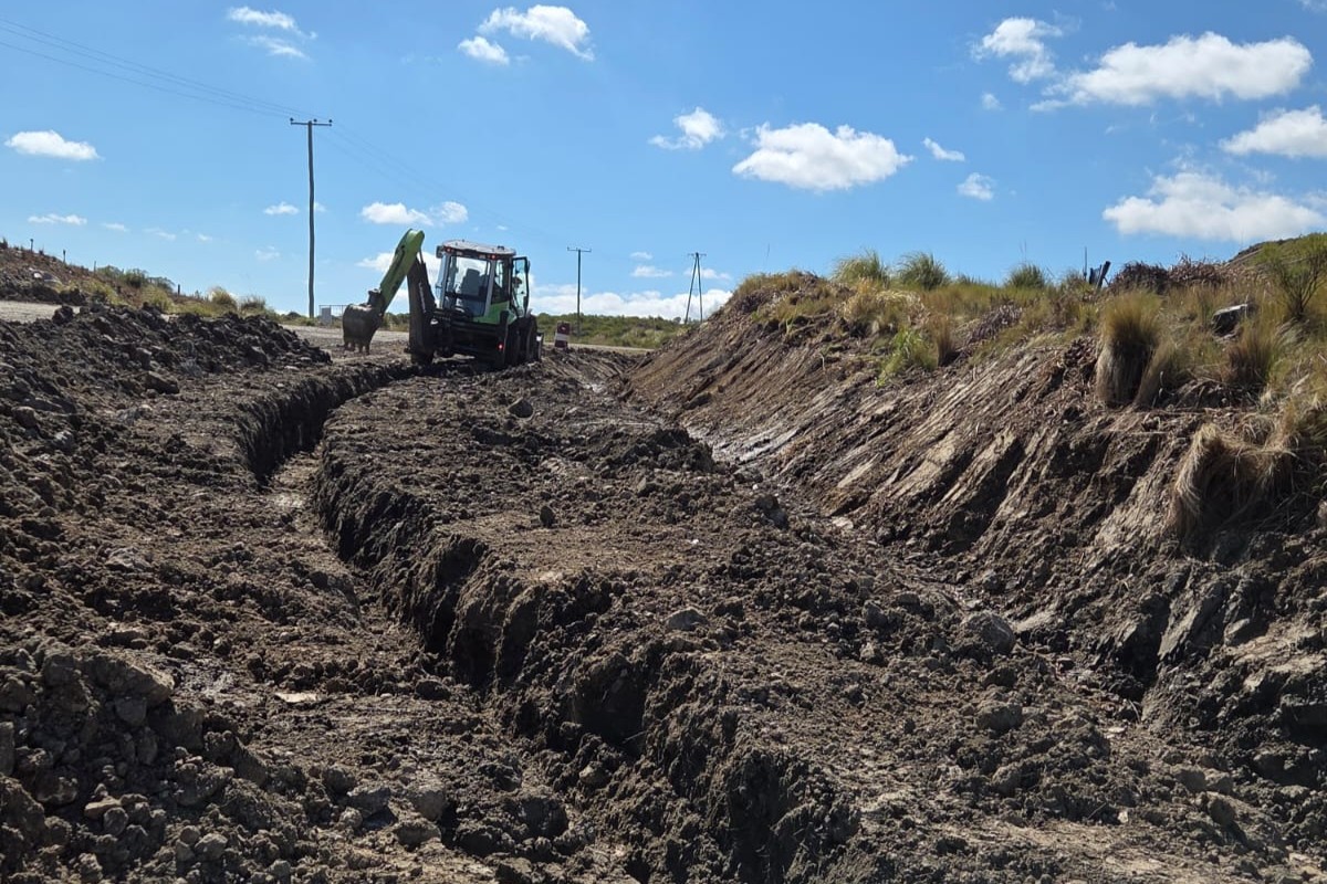 Los equipos realizan tareas de apertura y acondicionamiento de desagües, un trabajo clave para evitar acumulación de agua y deterioro prematuro del camino. Las cuadrillas avanzan con maquinaria pesada y labores manuales, adecuando el terreno y reforzando sectores con material triturado.
