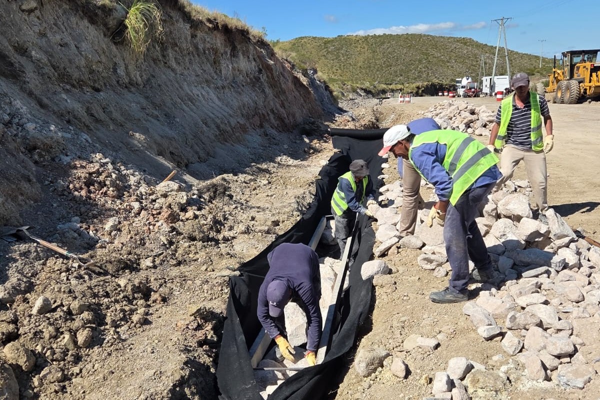 Los equipos realizan tareas de apertura y acondicionamiento de desagües, un trabajo clave para evitar acumulación de agua y deterioro prematuro del camino. Las cuadrillas avanzan con maquinaria pesada y labores manuales, adecuando el terreno y reforzando sectores con material triturado.