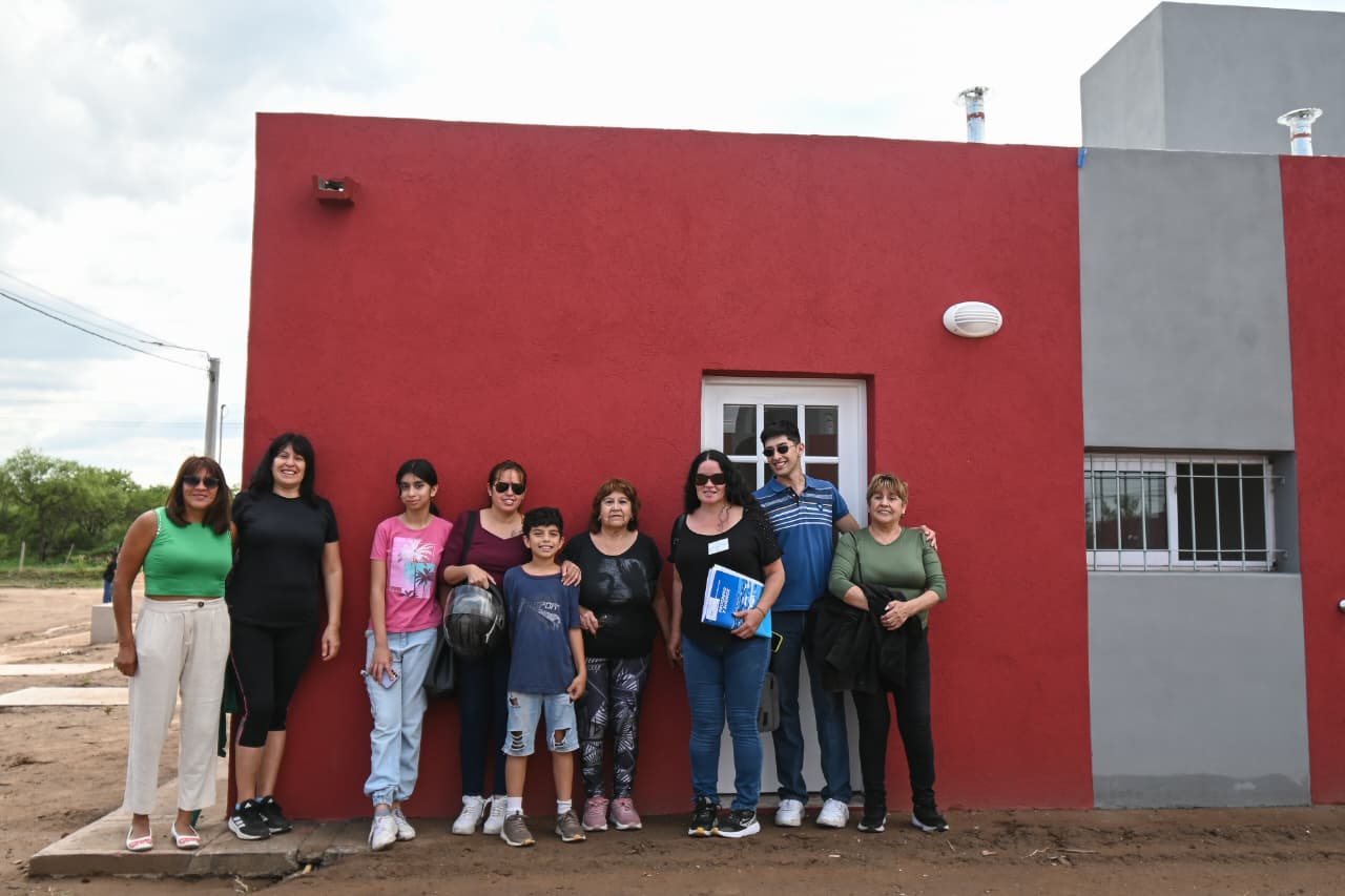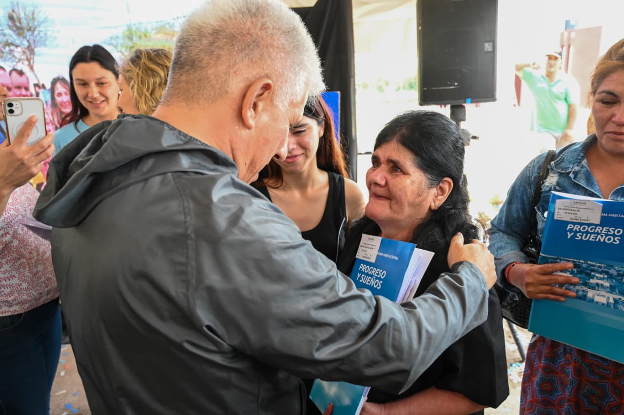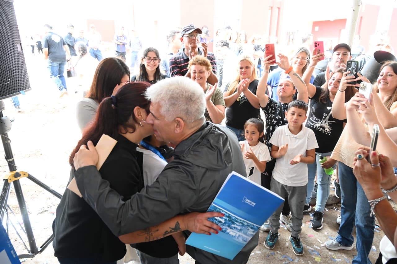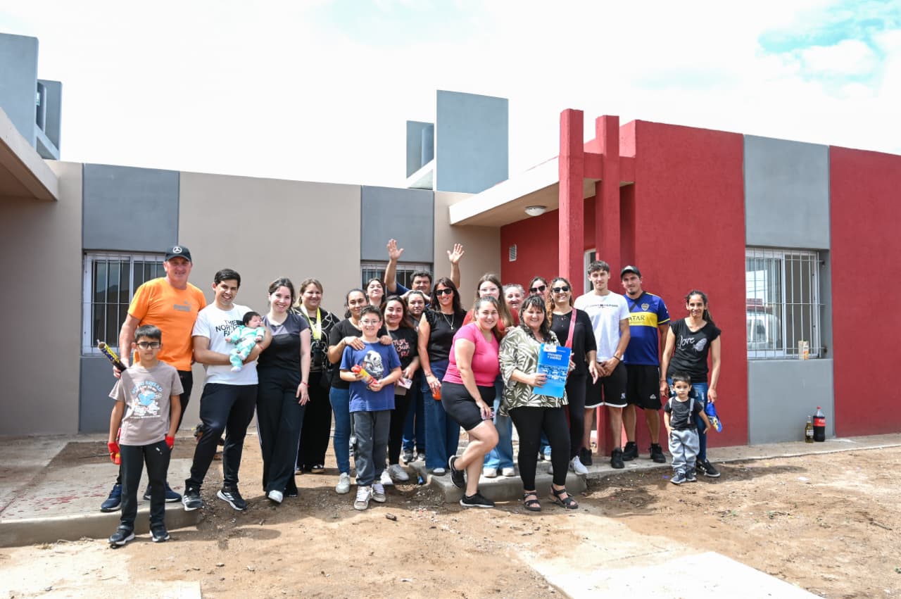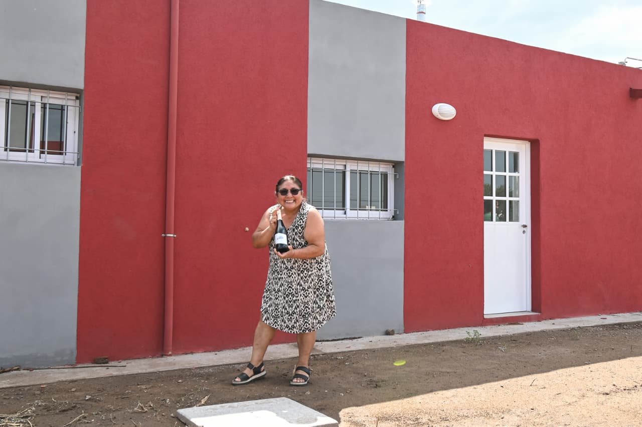 Llaves en manos temblorosas, abrazos por doquier, lágrimas, camiones rebalsados de cocinas, heladeras y muebles, brindis y fotos en un acto desbordado de emociones en Juana Koslay.