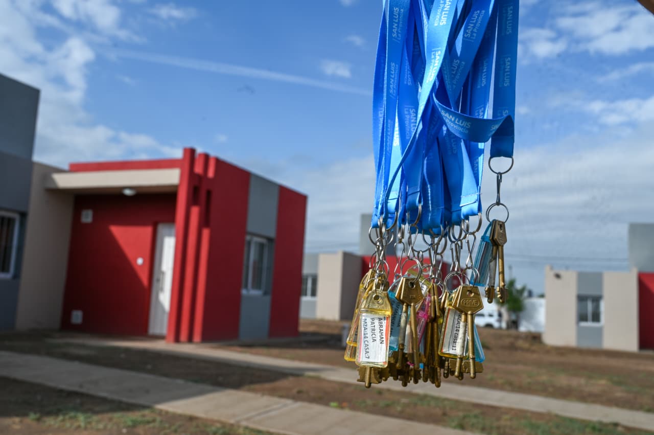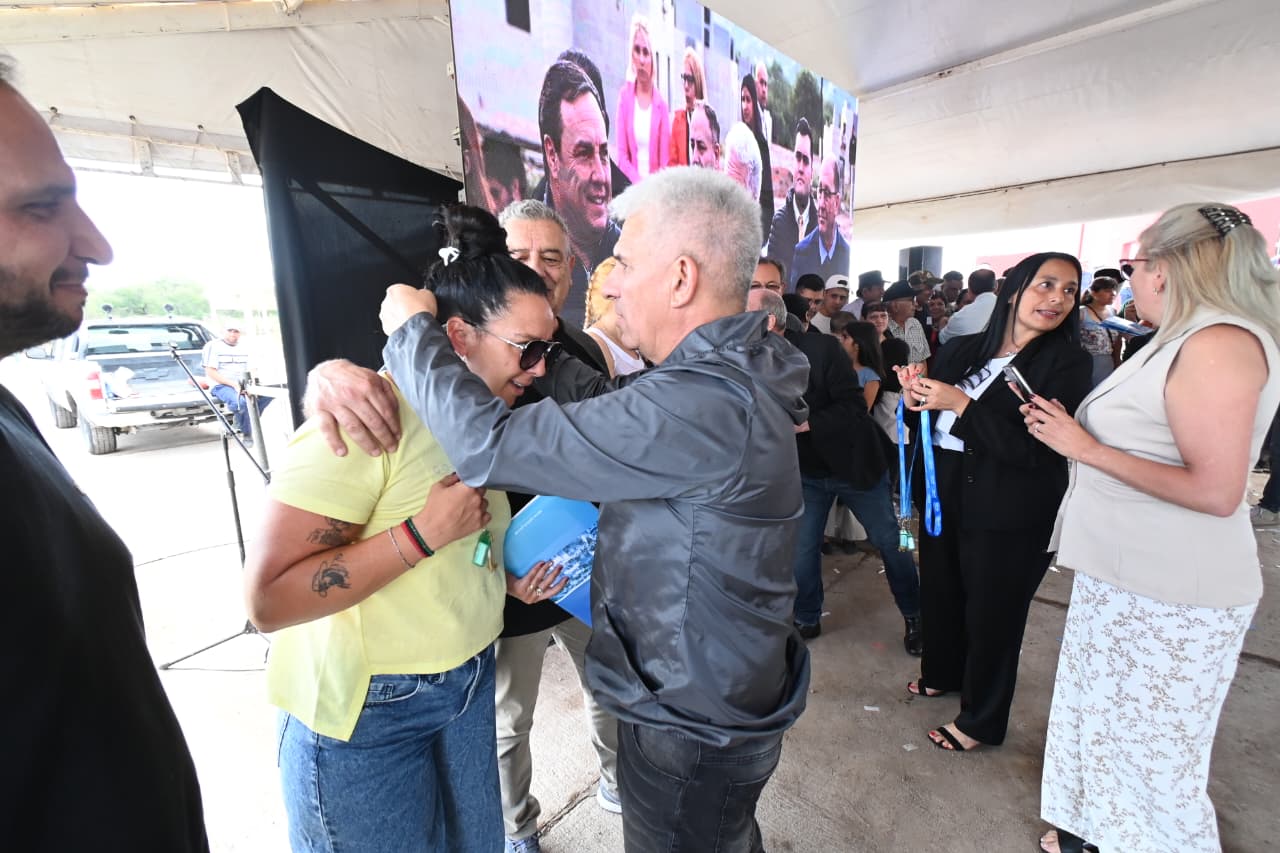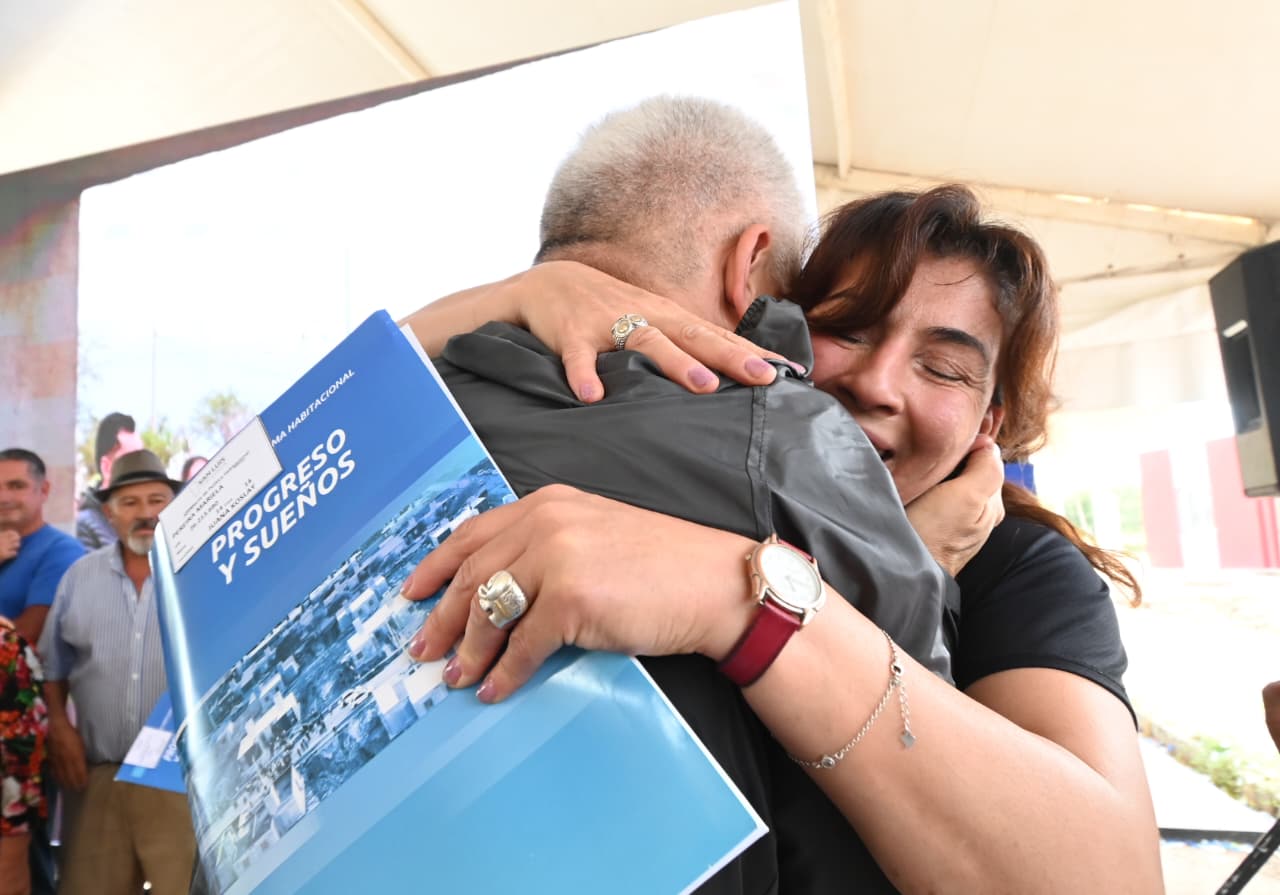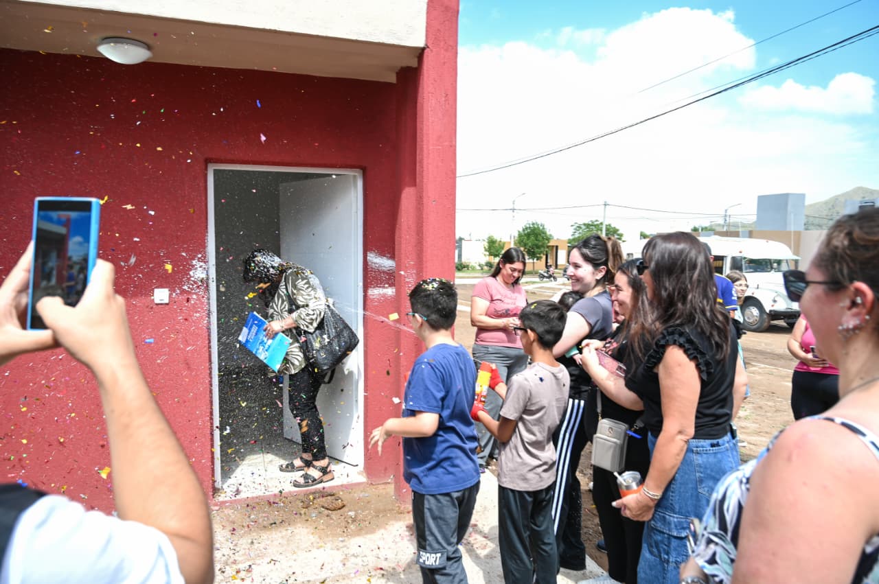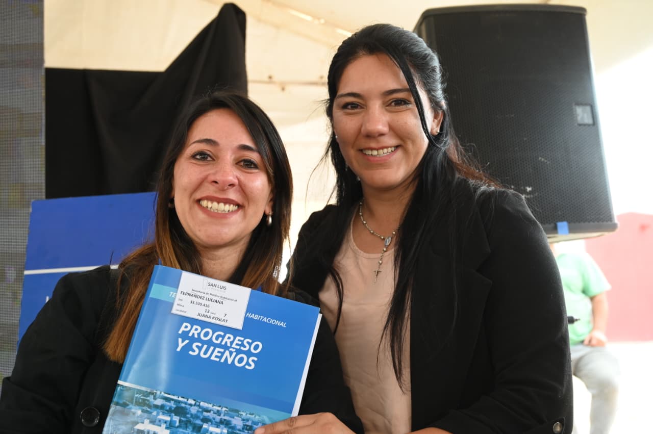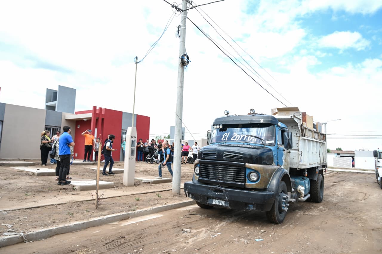 Llaves en manos temblorosas, abrazos por doquier, lágrimas, camiones rebalsados de cocinas, heladeras y muebles, brindis y fotos en un acto desbordado de emociones en Juana Koslay.