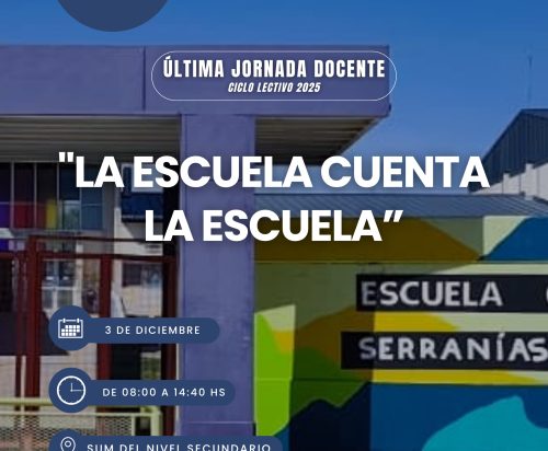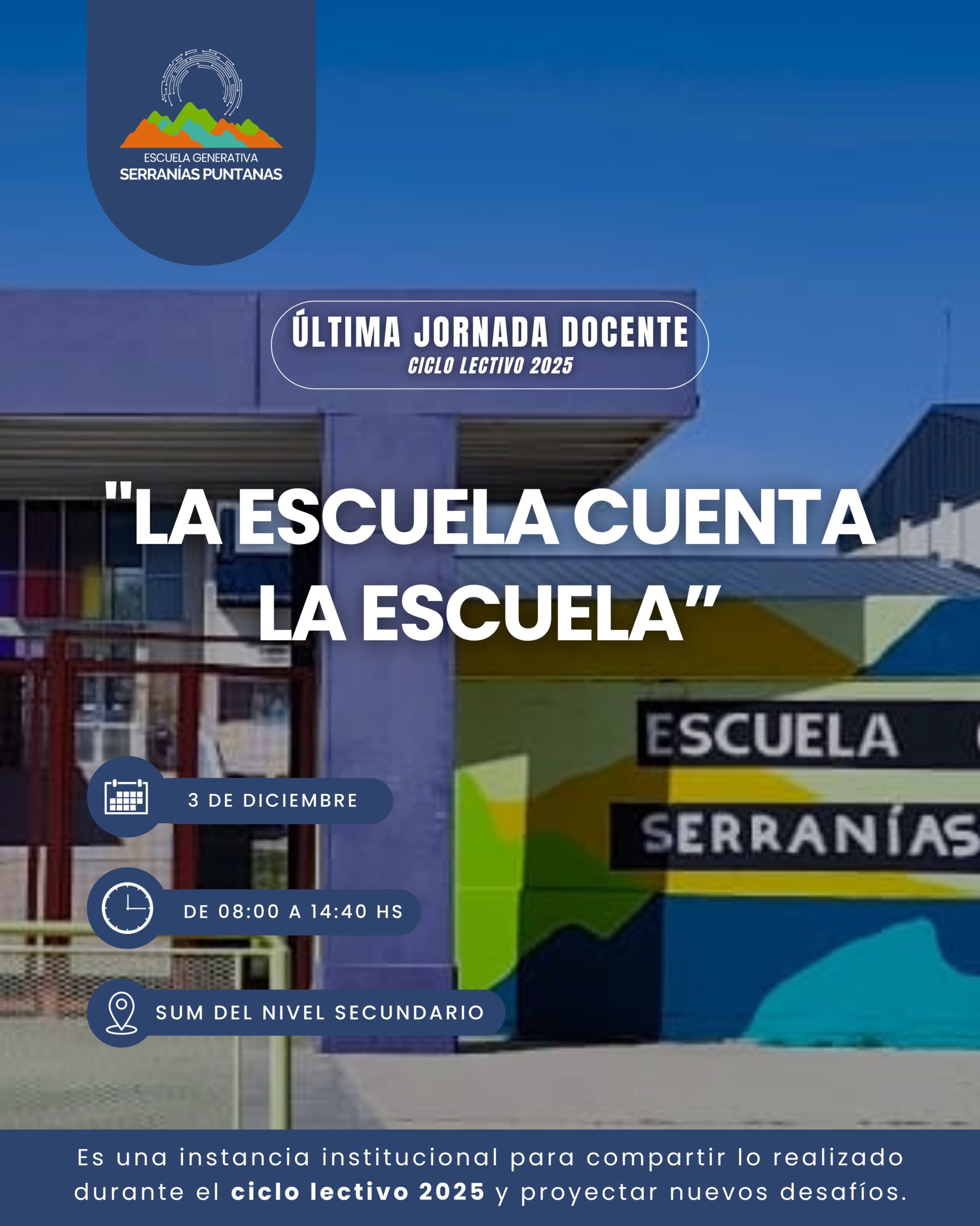 La Escuela Generativa ‘Serranías Puntanas’ llevará adelante su última jornada docente del año, que por primera vez será a puertas abiertas. Bajo el nombre ‘La Escuela cuenta la Escuela’, la propuesta busca institucionalizar esta modalidad para que, cada cierre de ciclo, la comunidad educativa pueda mostrar y reflexionar colectivamente sobre lo construido a lo largo del año.