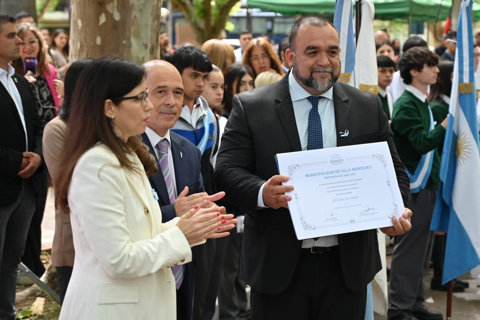 Entre las autoridades presentes se destacó Miguel Ángel Bonino, primer intendente de Villa Mercedes tras el regreso de la democracia en 1983, y la presidenta de la Junta de Estudios Históricos, Estela Maris Curtis, quien brindó palabras alusivas a la fecha. En el marco del acto, legisladores nacionales y provinciales entregaron reconocimientos a la ciudad de Villa Mercedes con motivo de su aniversario, que fueron recibidos por el intendente Maximiliano Frontera.