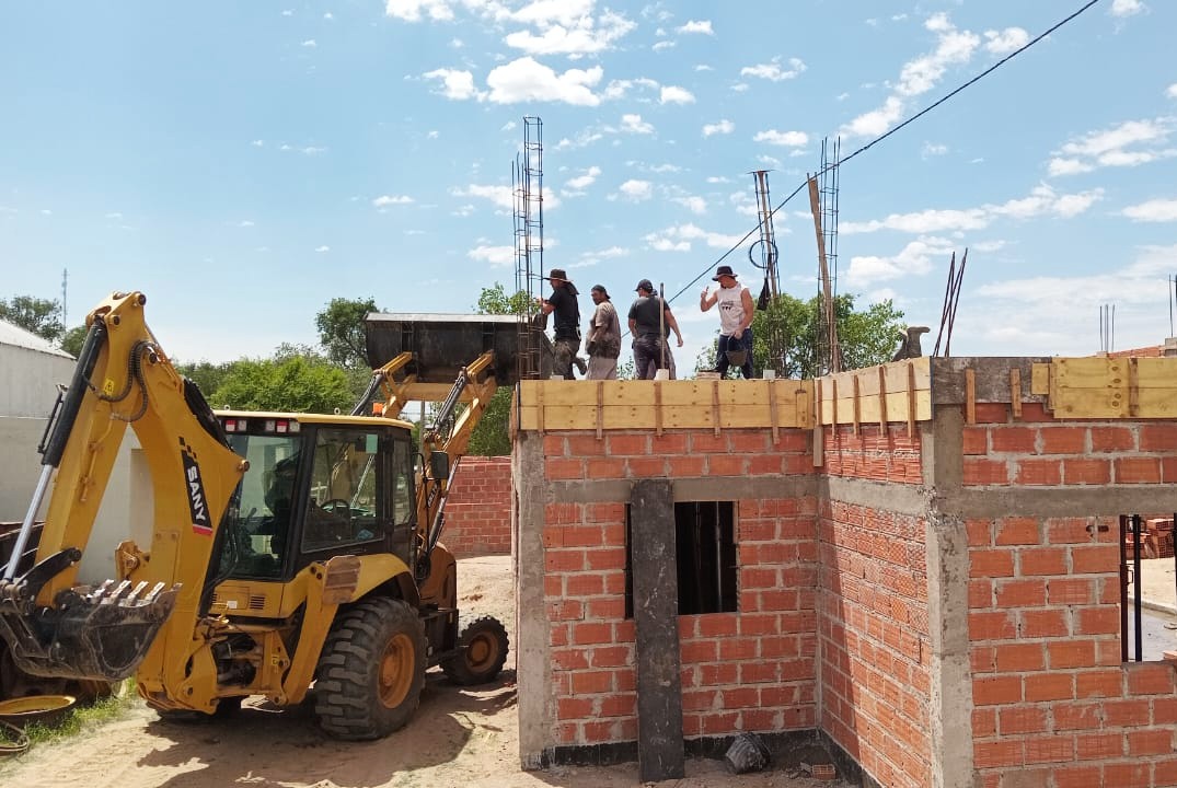 En paralelo, maquinaria pesada colabora con el traslado de materiales y con las tareas en altura, donde los operarios realizan el encofrado y el hormigonado de las vigas que sostendrán la futura cubierta. La obra mantiene una dinámica sostenida, con varios frentes activos de manera simultánea, consolidando la estructura del edificio y acercando una mejora fundamental para el sistema de salud de la localidad.