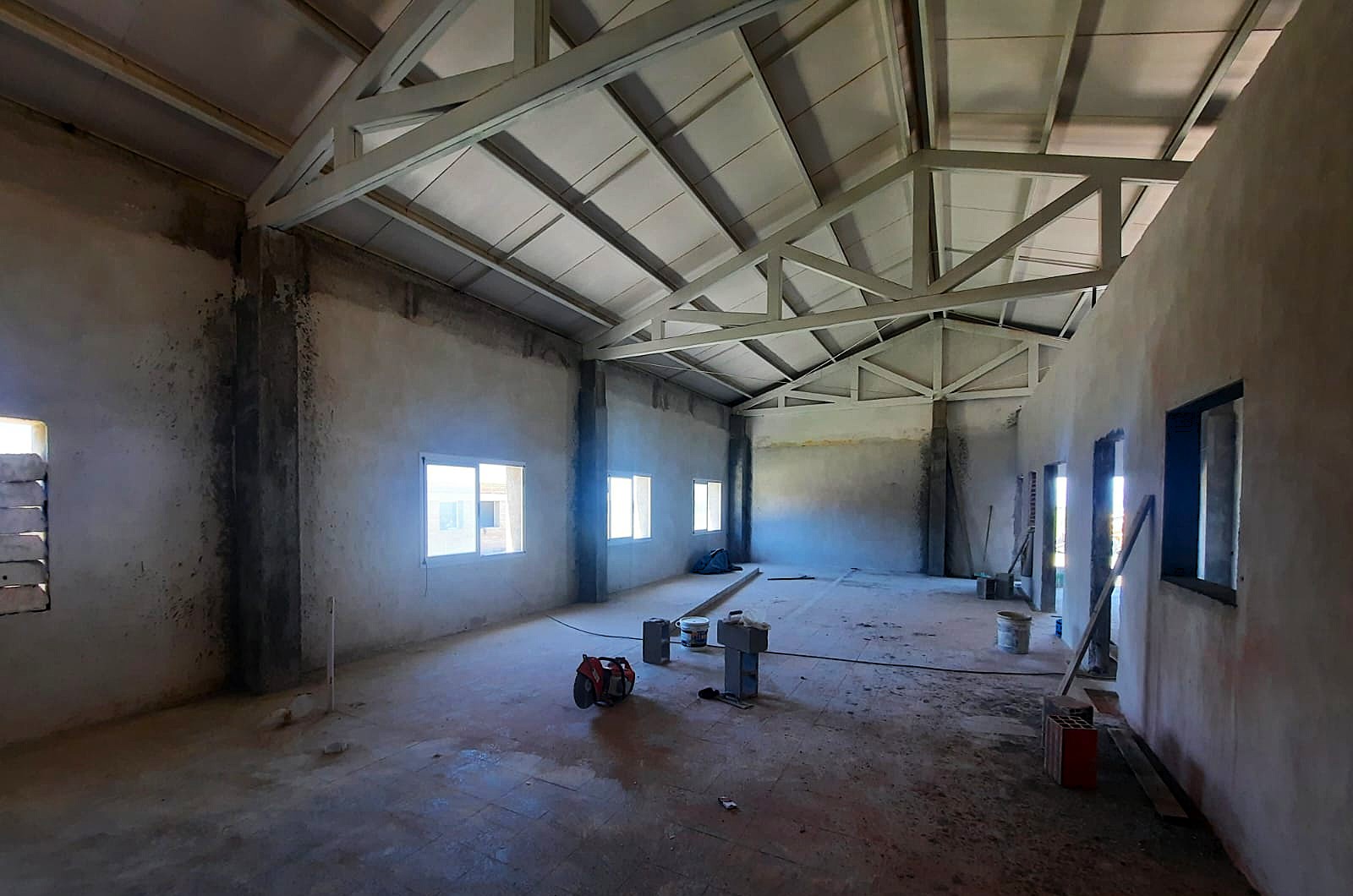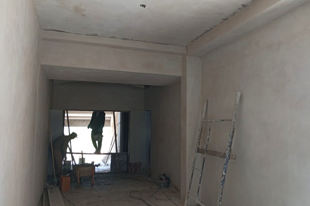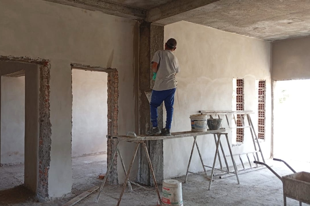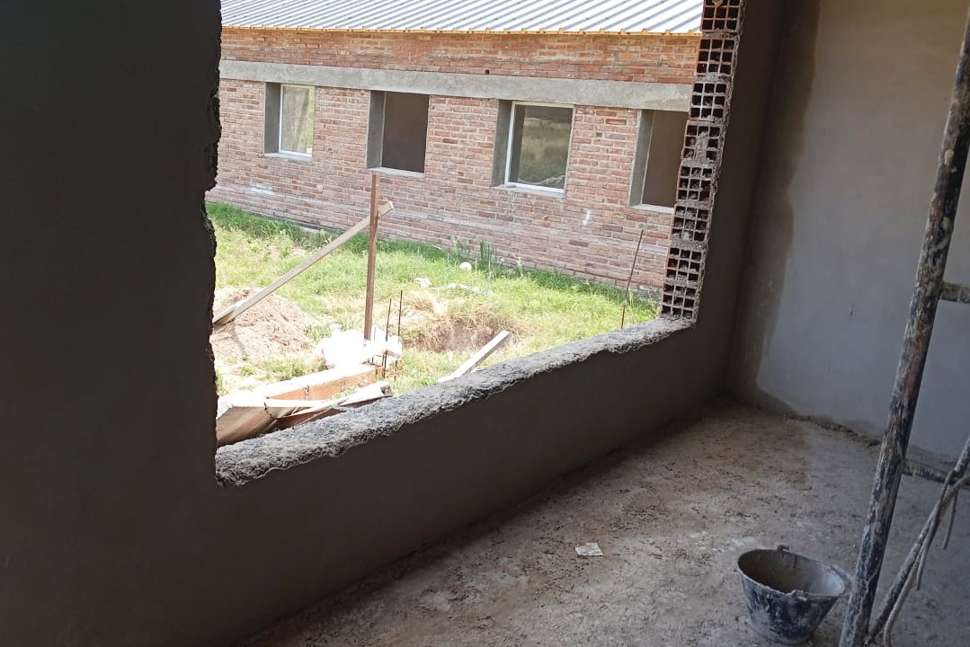 En esta etapa también se trabaja en los acabados interiores, con revoques finos y regularización de superficies en distintos sectores, como preparación para los revestimientos finales. El piso se encuentra en proceso de preparación para recibir su revestimiento definitivo, uno de los pasos previstos para las próximas semanas.