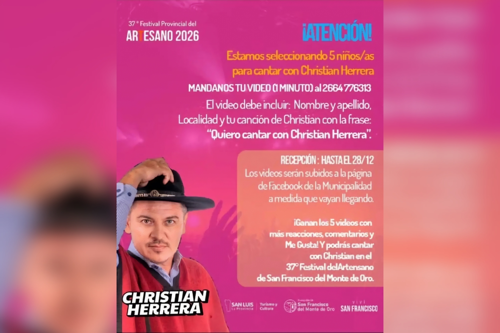 Días atrás, la municipalidad de San Francisco del Monte de Oro presentó el concurso ‘Quiero cantar con Christian’, una novedosa iniciativa que permitirá que cinco niños de hasta 12 años sean seleccionados para compartir escenario con el destacado cantante popular Christian Herrera, en el 37º Festival Provincial del Artesano, que tendrá lugar el 2 de enero de 2026.
