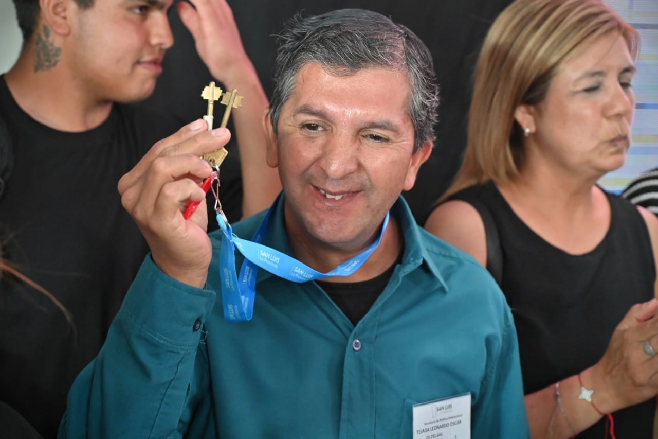 Leonardo Tejada junto a su esposa Marina Morán recibieron este martes, la llave de su nuevo hogar de la mano del gobernador Claudio Poggi. La alegría es inmensa, por eso esta misma tarde empezarán a vivir abrigados bajo su techo propio.