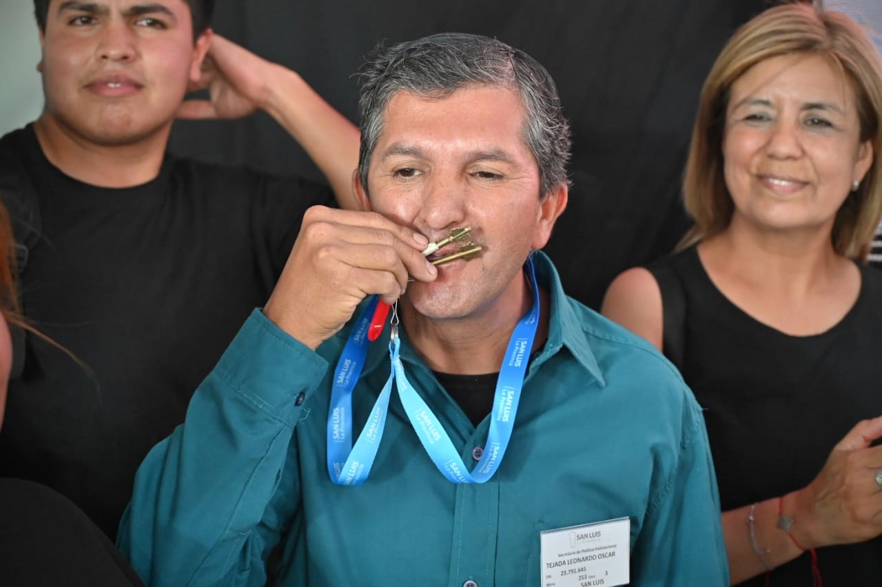Leonardo Tejada junto a su esposa Marina Morán recibieron este martes, la llave de su nuevo hogar de la mano del gobernador Claudio Poggi. La alegría es inmensa, por eso esta misma tarde empezarán a vivir abrigados bajo su techo propio.