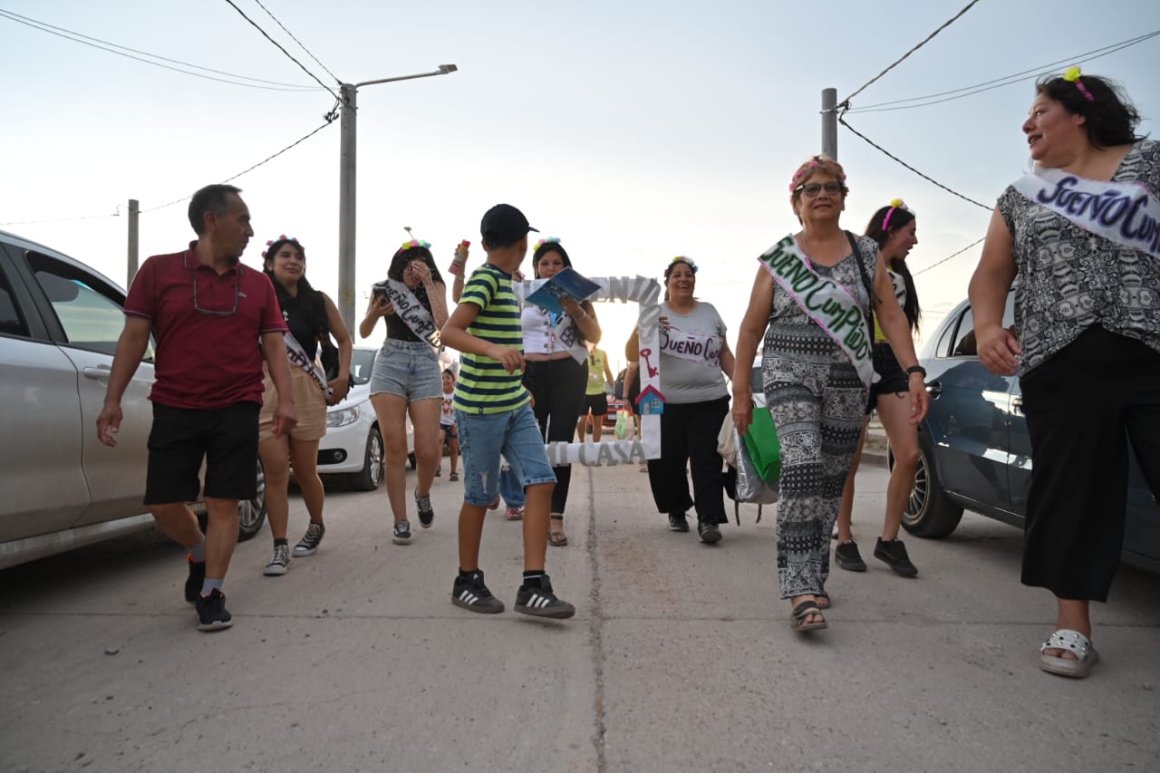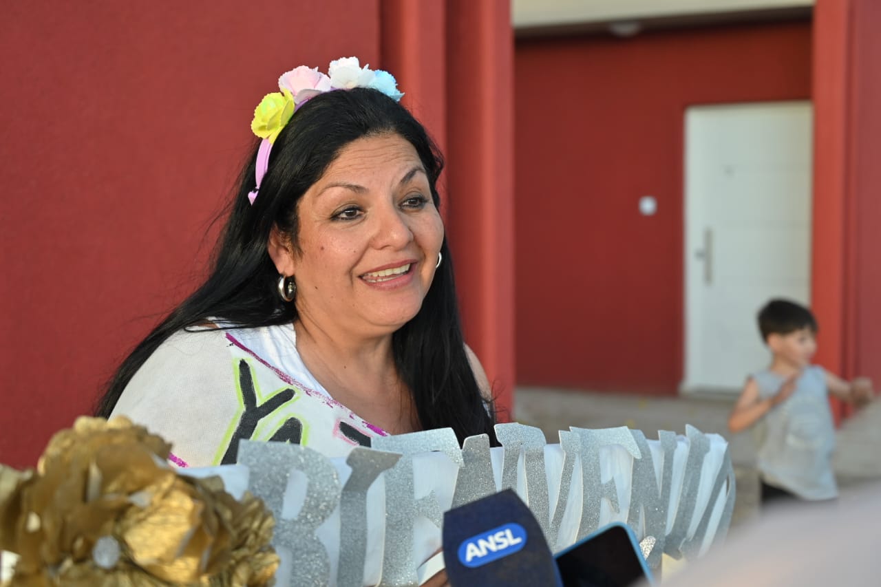 Alexandra Leyes, desde la puerta de su hogar aseguró: “Hoy estoy en mi casa” y describió el momento como felicidad pura. Sus amigos y familiares viajaron desde Villa Mercedes y Fraga para ser parte de este momento único en su vida: estrenar techo propio. “Hay que tener mucha fe, todo llega, todo llega”, se sinceró.