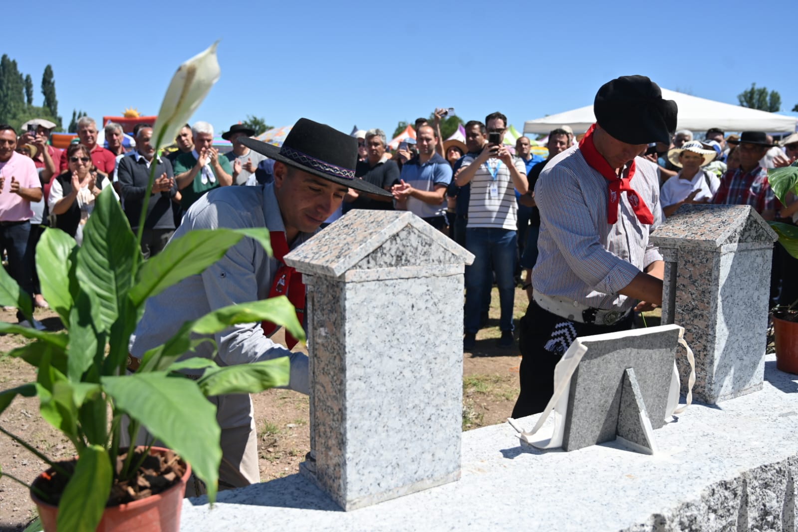 Posteriormente, se realizó el descubrimiento de la placa de conmemorativa en la que se puede leer “Homenaje del pueblo de Potrerillo a los trabajadores del granito”. Asimismo, hicieron su ingreso las imágenes de la Virgen de la Paz y el Santo Cura Brochero, en manos de los gauchos Sergio Garro y Fernando Castillo, pertenecientes a la agrupación San Expedito.