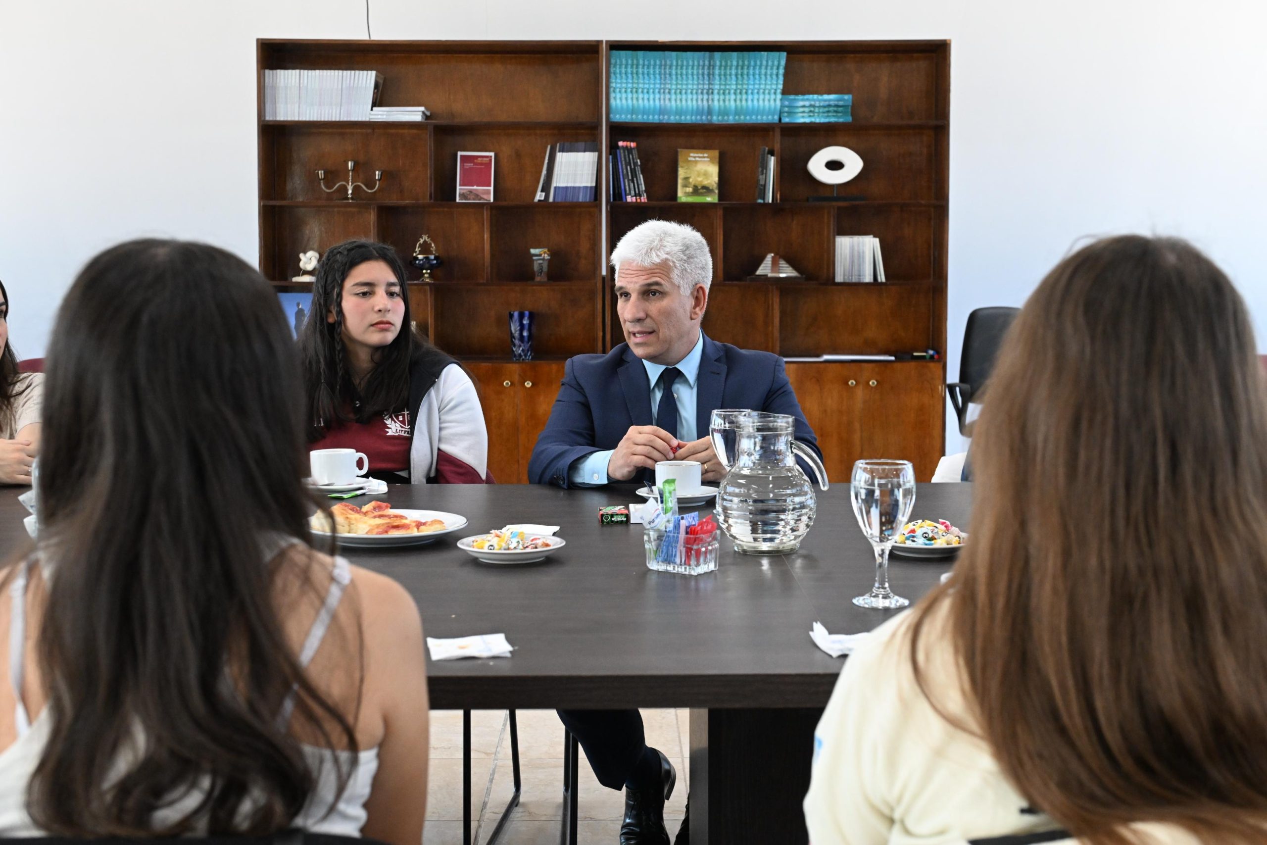 Este martes, en horas matutinas, el gobernador Claudio Poggi y el ministro de Educación, Guillermo Araujo, agasajaron a ocho alumnos que obtuvieron el primer promedio en la culminación de sus estudios secundarios. Los jóvenes pudieron interactuar con el Mandatario y hablar sobre sus futuros académicos en un clima de camaradería.