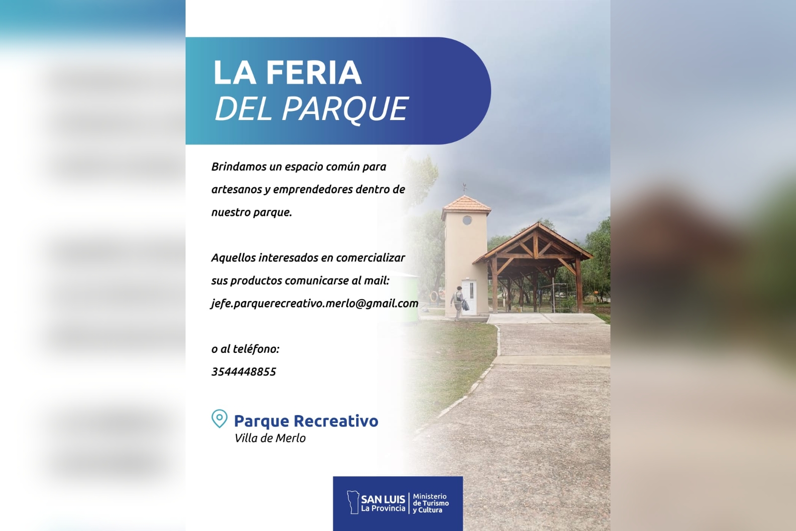 Las autoridades del Parque Recreativo de la Villa de Merlo, cuya administración depende del ministerio de Turismo y Cultura, abrieron recientemente una convocatoria a emprendedores y artesanos de la región que deseen sumarse a la ‘Feria del Parque’. La intención es potenciar el desarrollo comercial y cultural de la ciudad turística, de cara a la temporada de verano.
