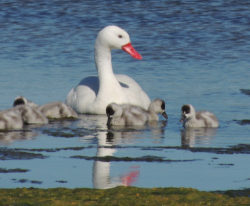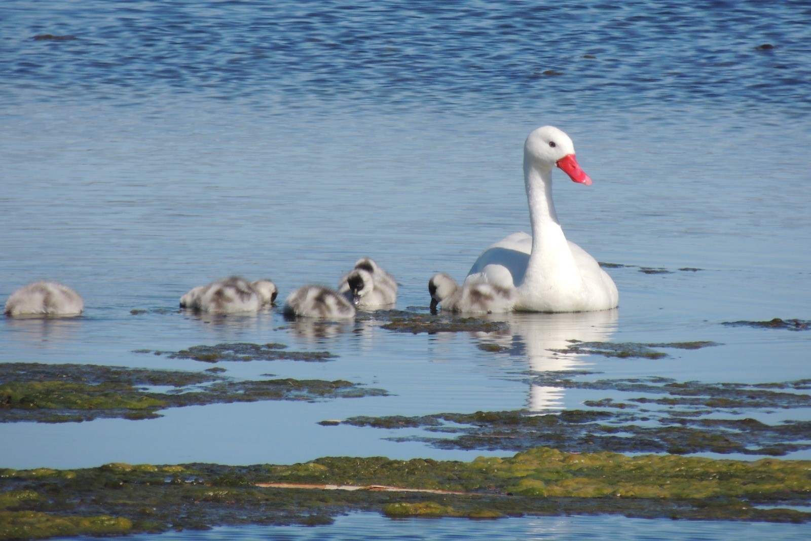 El cisne coscoroba (Coscoroba coscoroba) es un anátido de color blanco distintivo, con un pico brillante algo parecido al de un pato. Las puntas de las alas negras están usualmente ocultas cuando nada. Más probable de confundirlo con aves acuáticas domésticas y blancas. Bastante común puede ser visualizado en lagos, ríos y humedales. A menudo en grupos. Los polluelos son pardos con una máscara negra, pero se parecen mucho a los adultos dentro de un mes o dos después de haber eclosionado.