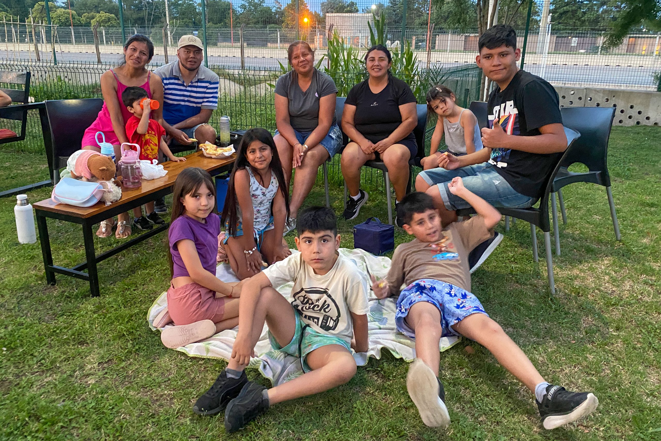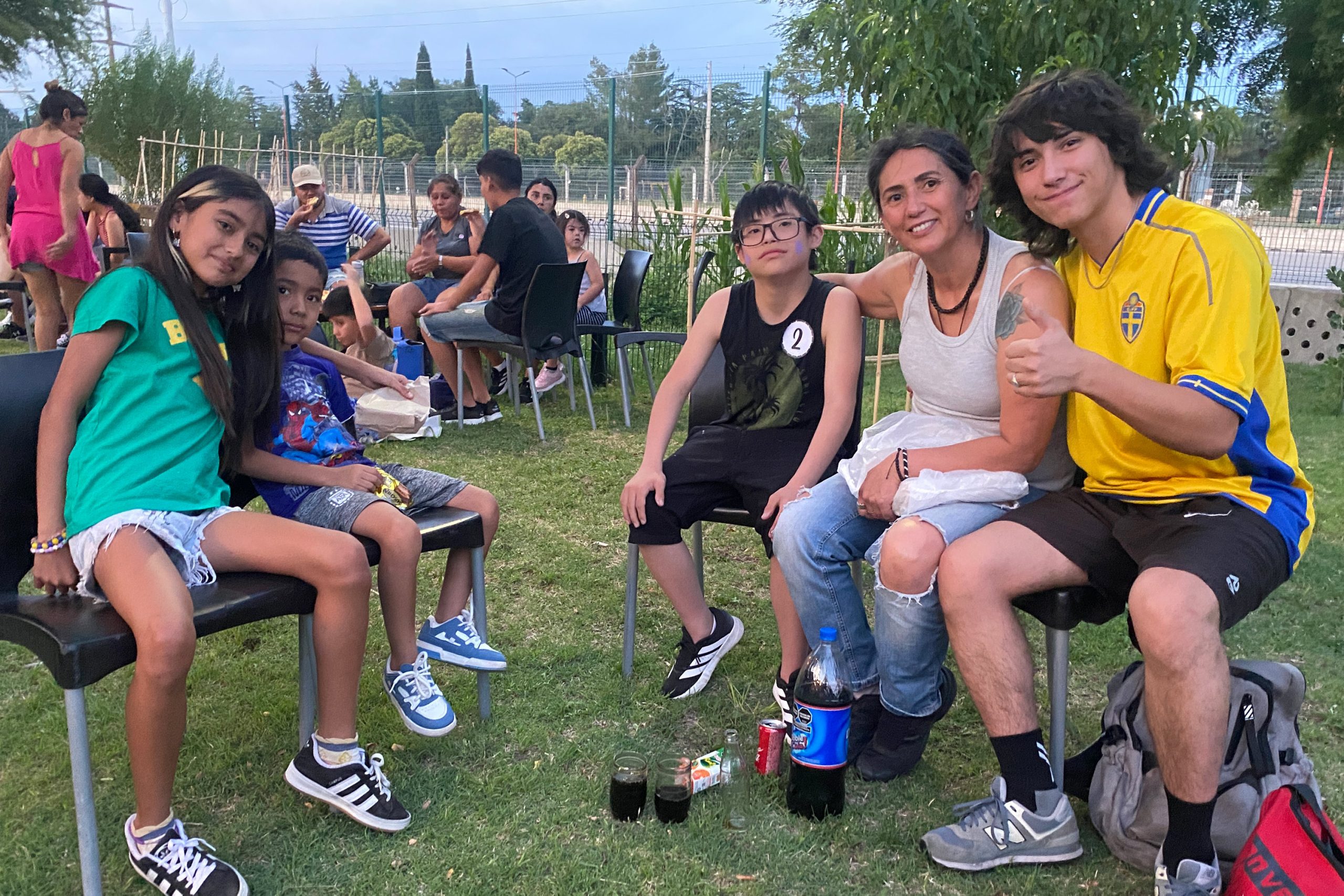 Las familias llegaron preparadas para disfrutar la jornada: llevaron reposeras, mates y alimentos navideños. Más tarde se compartieron empanadas, generando un ambiente cálido y de convivencia. Antes del fogón, los jóvenes realizaron una bandera comunitaria, cada uno imprimió sobre la tela la huella de su mano pintada, acompañada de su nombre. La bandera quedó como símbolo de identidad, pertenencia y del día compartido.