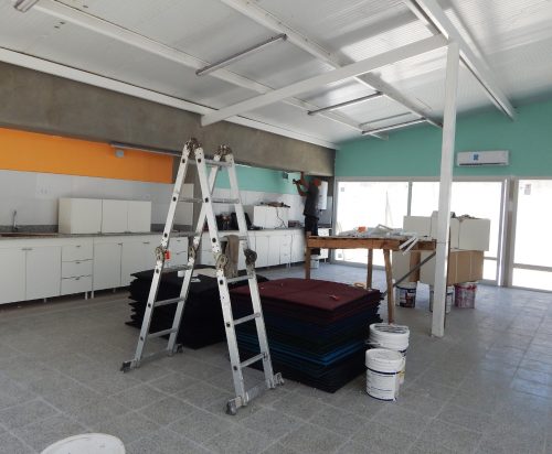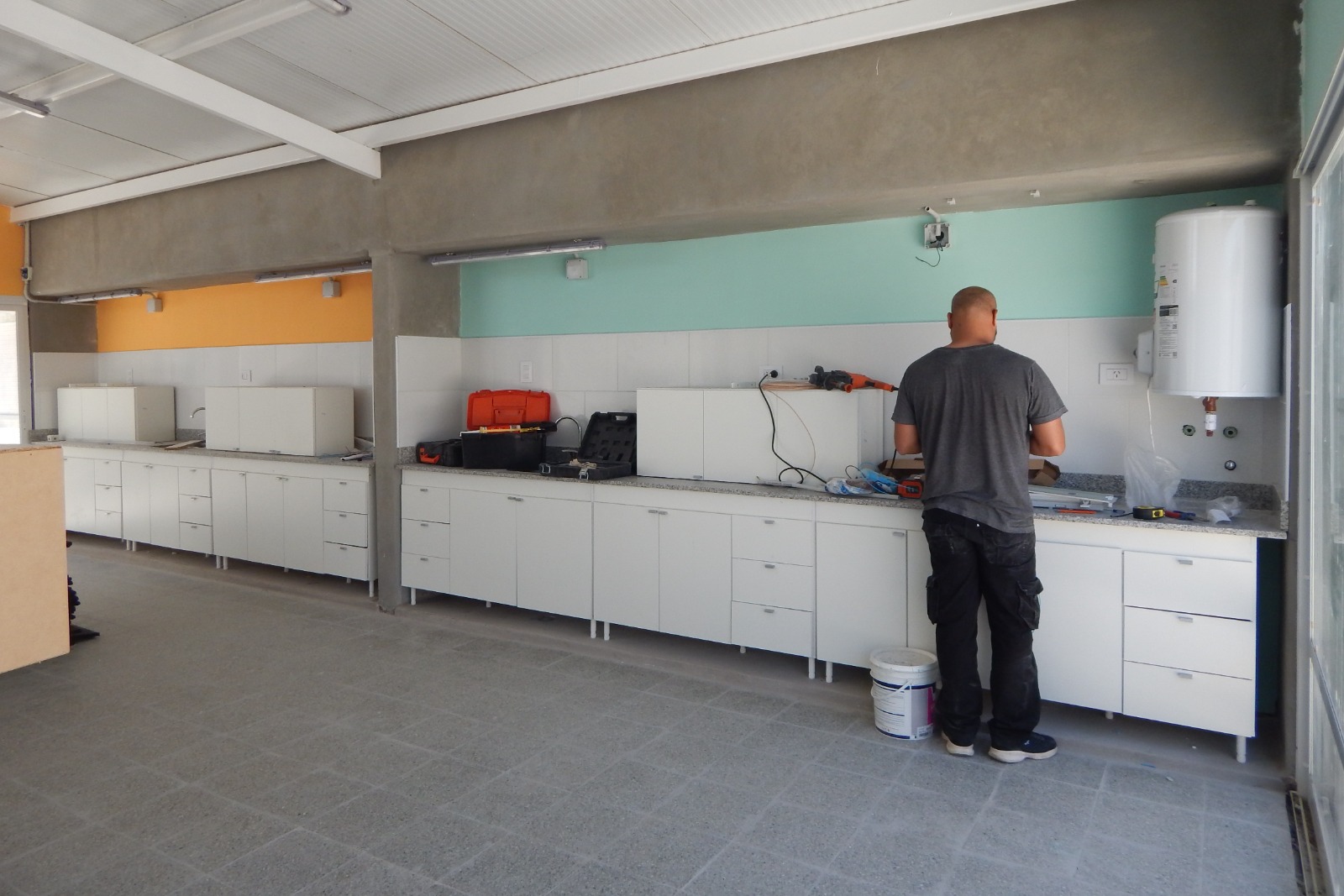 La dirección de Obras de Arquitectura y Viviendas confirmó que se completó la colocación de zócalos, cerámicos y mesadas con sus respectivas bachas y que se culminó con la iluminación general y la ejecución de pintura y revestimiento plástico en la fachada del edificio. Continúan con la coloración de muros exteriores y, además, completan la instalación de aires acondicionados y otros equipamientos.