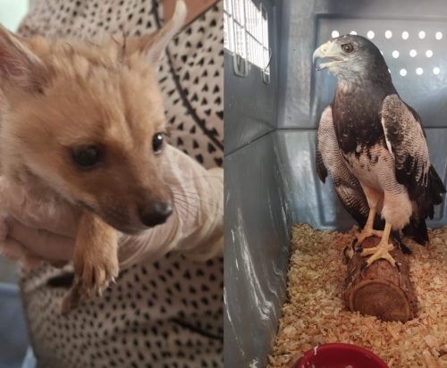 Ambos animales fueron auxiliados por el equipo veterinario de la Villa de Merlo y llegaron al CCVS con lesiones, pero mostraron una evolución prometedora: un zorrito huérfano y un águila mora lesionada en su ala.