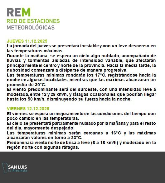 La mañana de este jueves comenzó con precipitaciones aisladas y nubosidades en el centro provincial. No obstante, la Red de Estación Metereológica (REM) informó que habrá una progresiva estabilidad hacia la media tarde, con máximas que podrían alcanzar los 31°C en algunas localidades.
