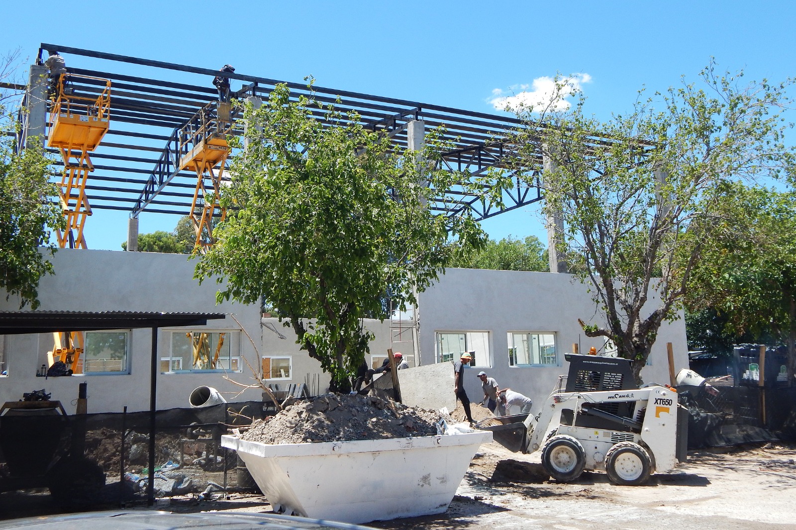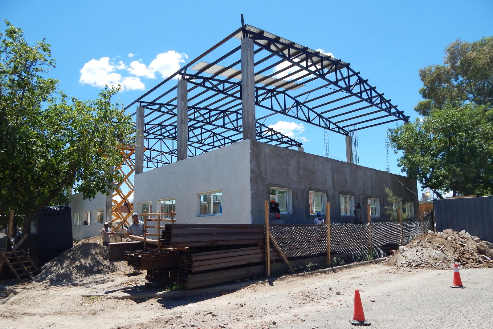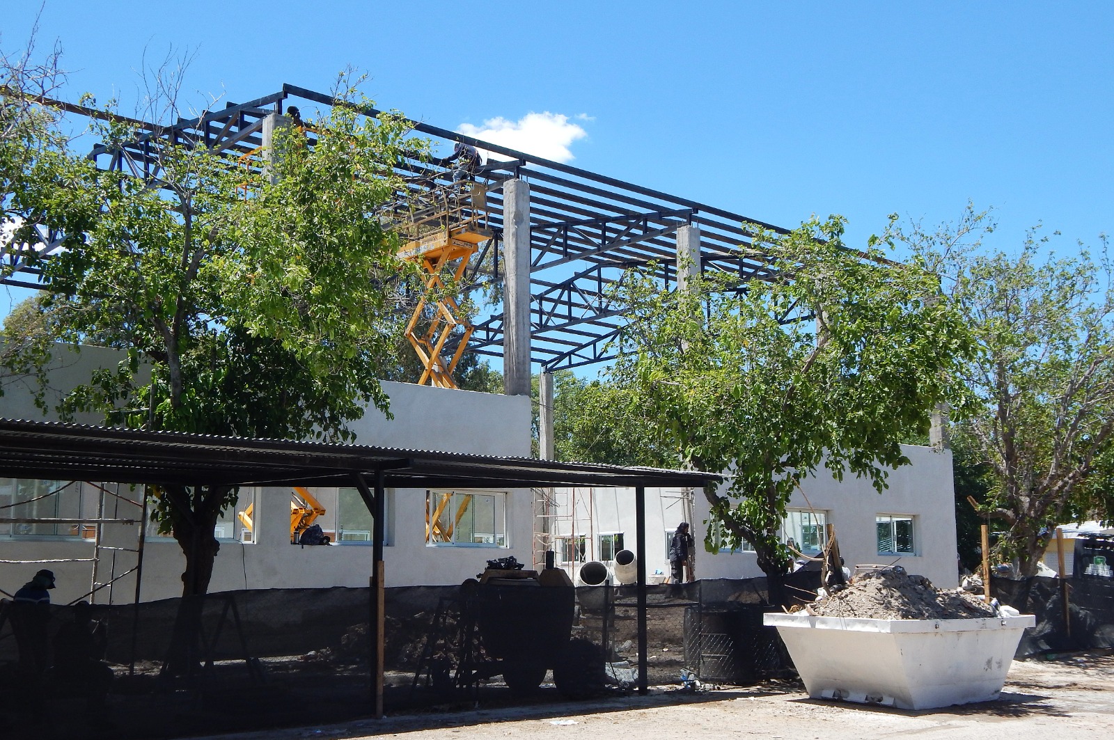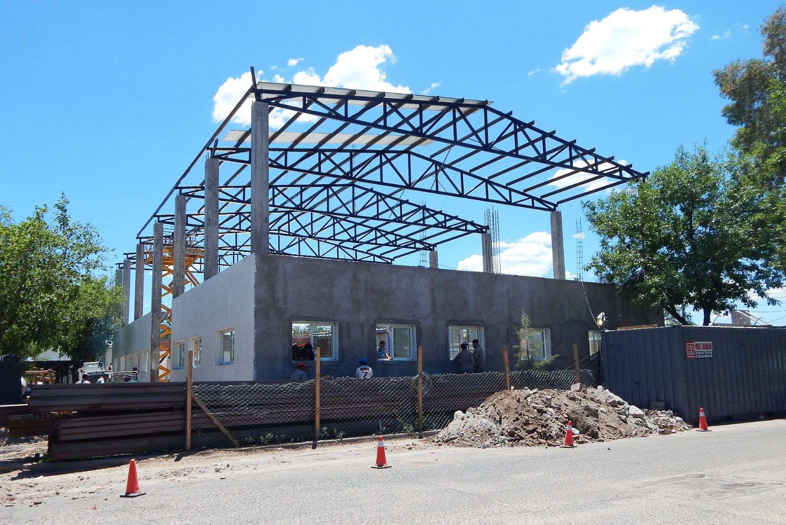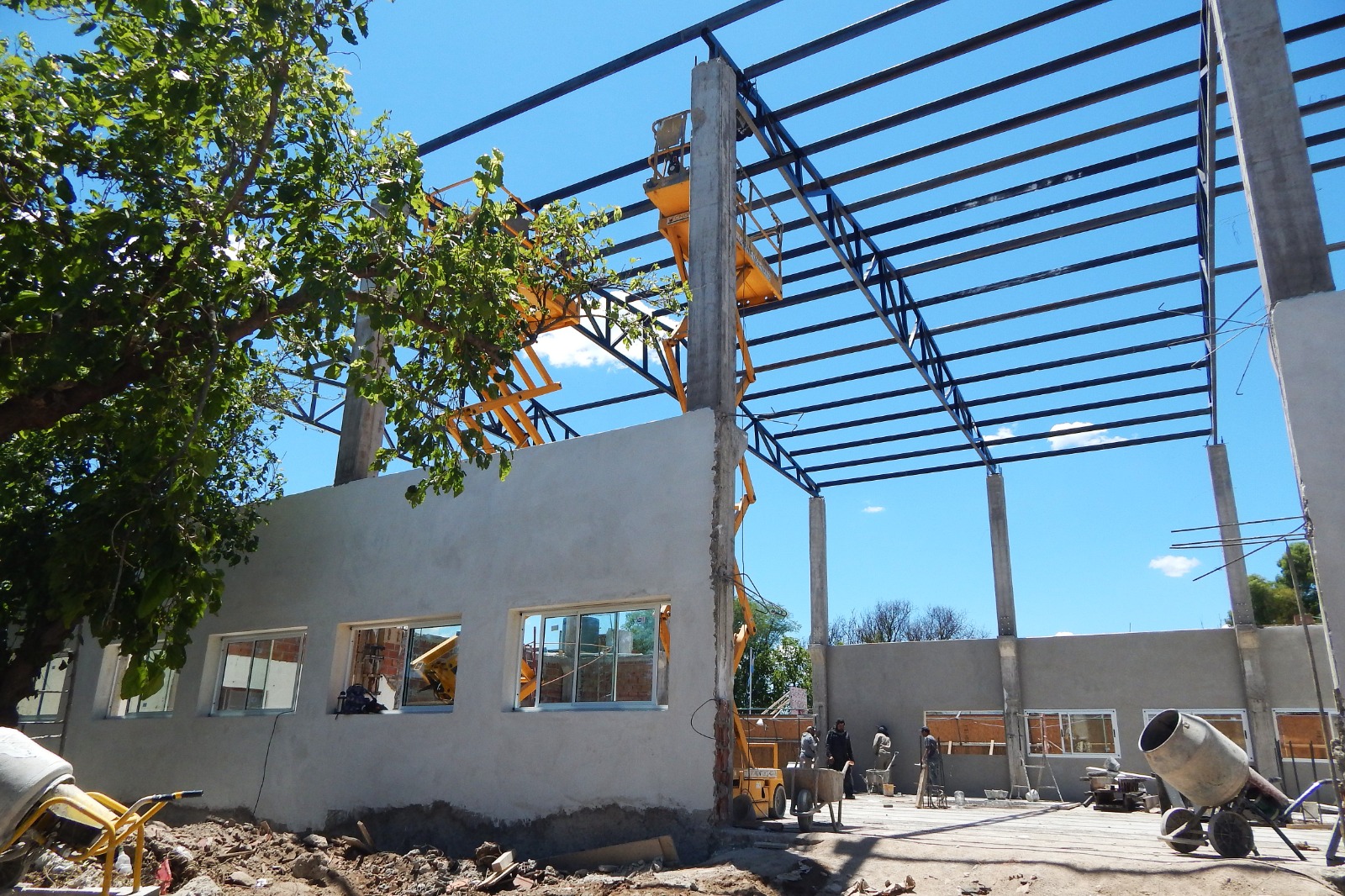 La estructura resistente y los muros están ejecutados, el techado metálico en instalación y se realizan tareas simultáneas de albañilería, soldadura, movimiento de suelo y organización del entorno.