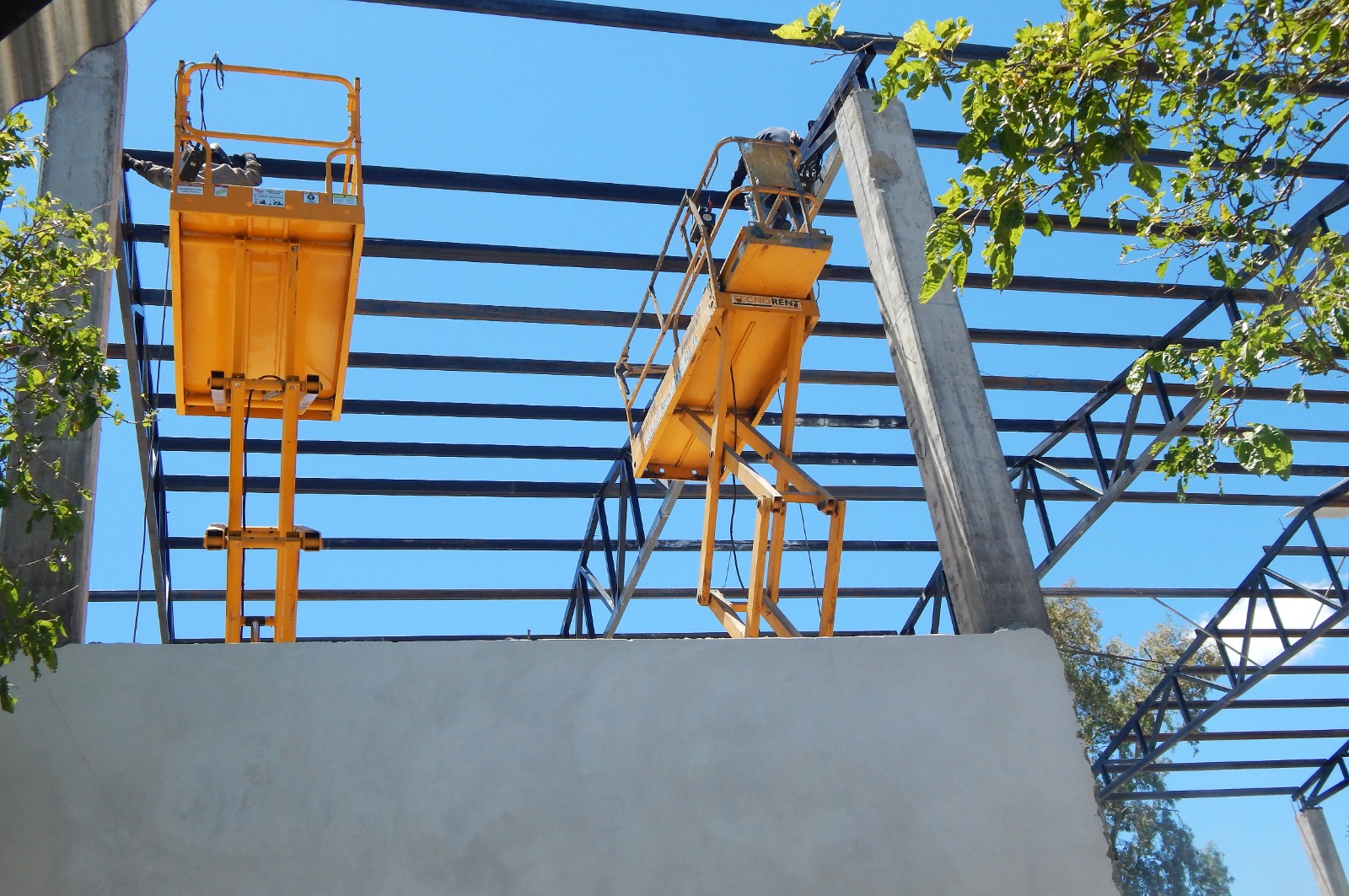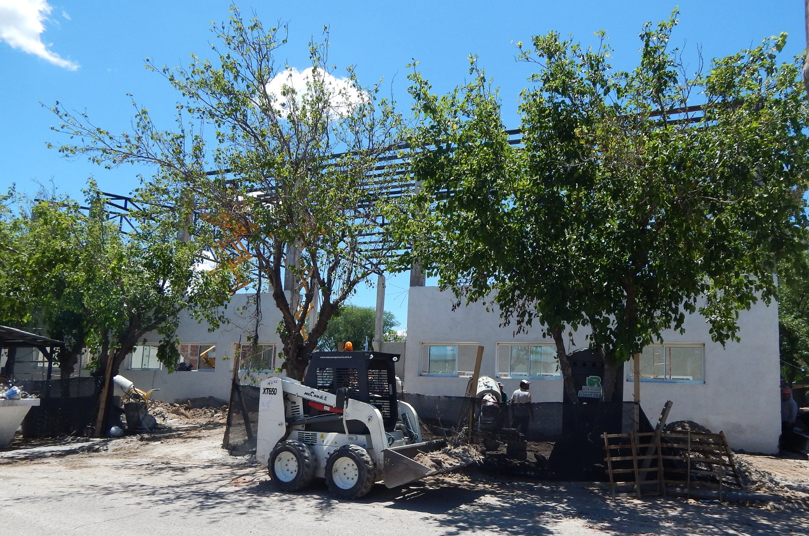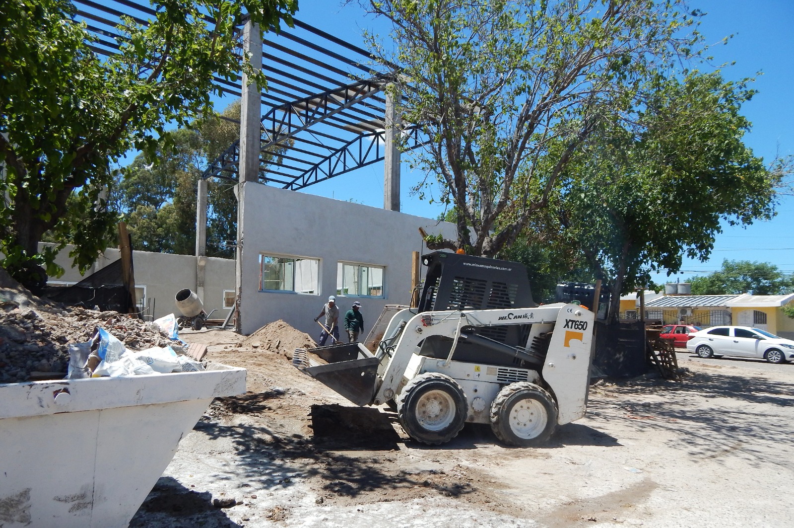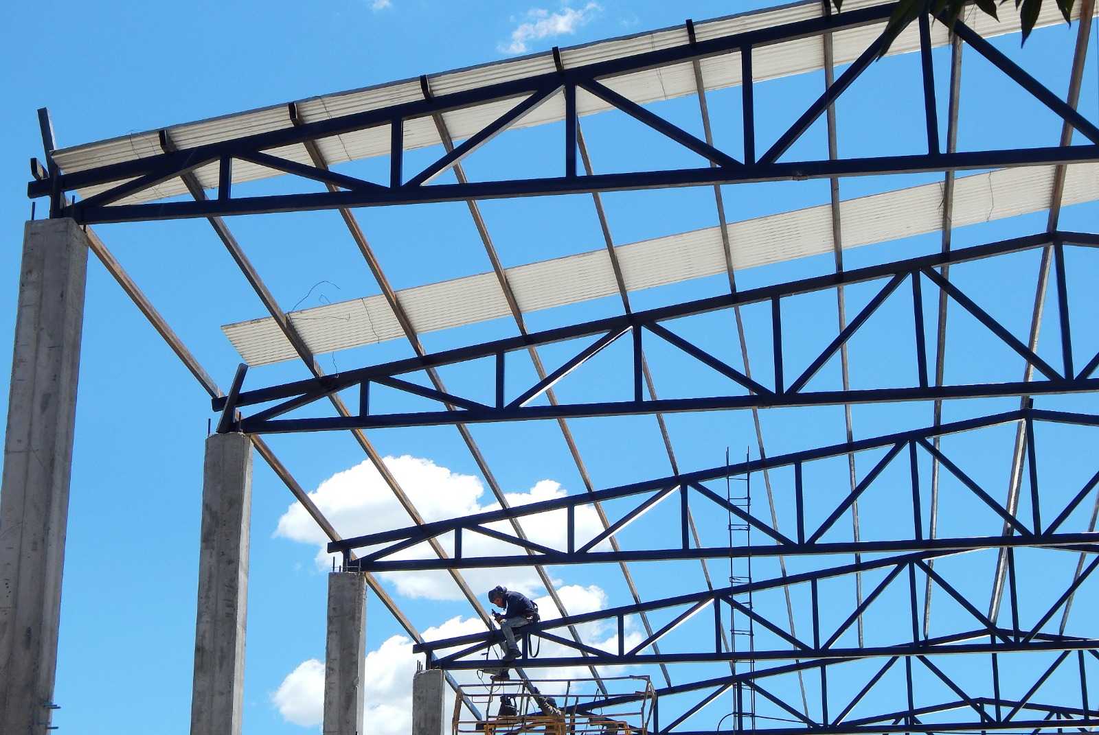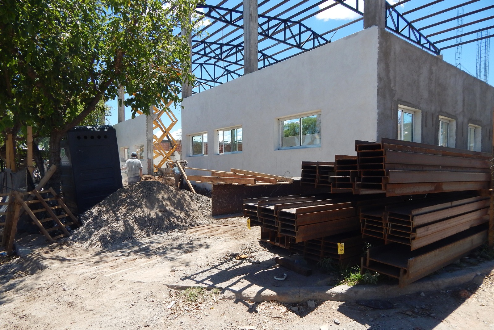 La estructura resistente y los muros están ejecutados, el techado metálico en instalación y se realizan tareas simultáneas de albañilería, soldadura, movimiento de suelo y organización del entorno.