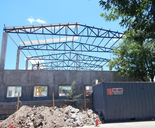 Actualmente se observa actividad de los trabajadores tanto en el interior como en el exterior del edificio. La dirección de Obras de Arquitectura y Viviendas detalló que, en síntesis, el proyecto se encuentra en una fase intermedia-avanzada. La estructura metálica del techo está completamente montada. Hay cerchas y vigas metálicas ya instaladas, con operarios trabajando en altura mediante plataformas elevadoras tipo tijera. Los pilares de hormigón están terminados y en uso para sostener la estructura metálica superior.