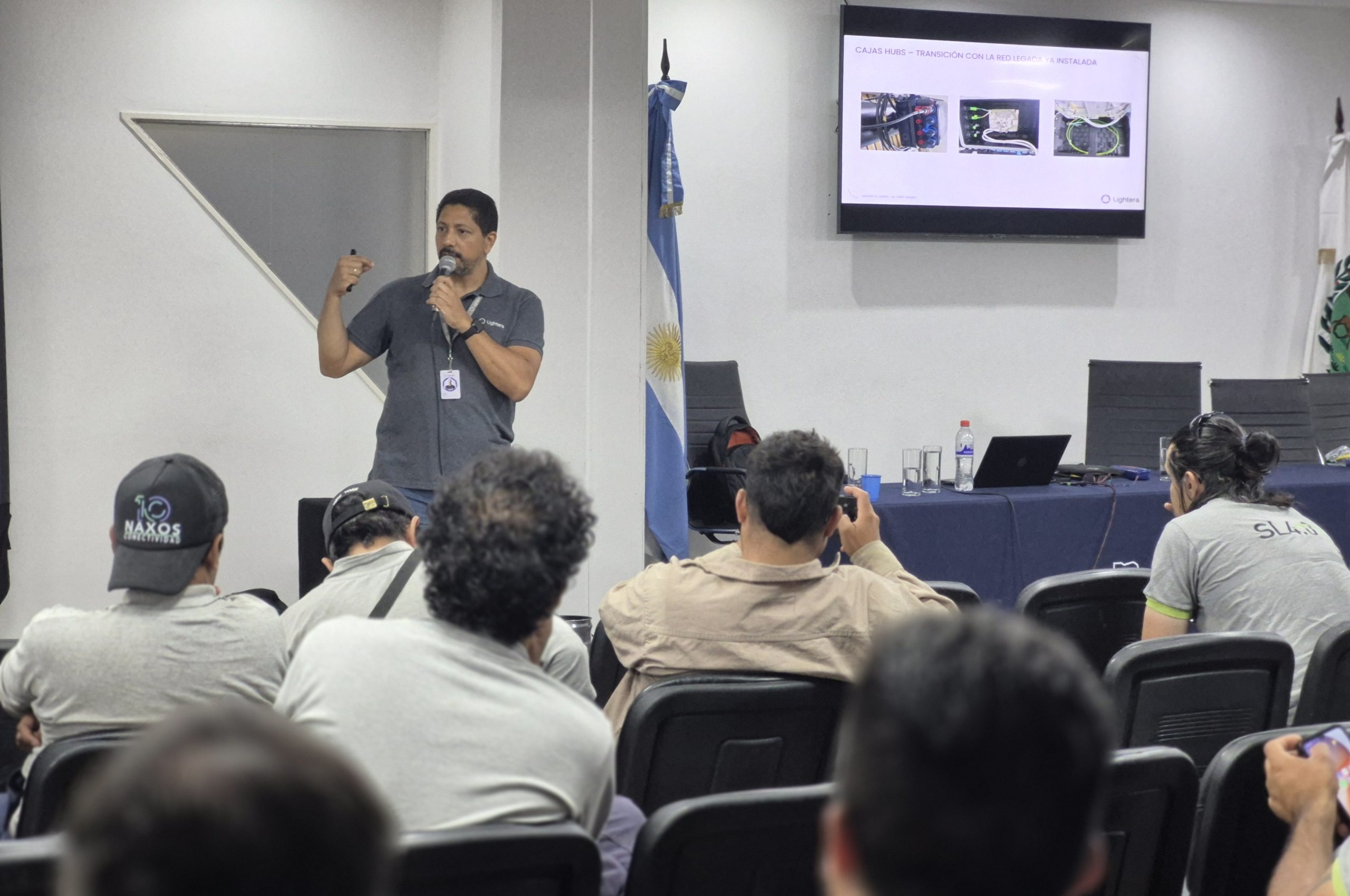 Los equipos participaron de una instancia teórica donde se abordaron conceptos clave de redes ópticas, como FTTH, punto a punto, cableado totalmente preconectorizado, y el funcionamiento de conectores multifibra capaces de integrar hasta 12 hilos en un solo puerto. Además, se repasaron buenas prácticas de instalación y procedimientos asociados al despliegue seguro y eficiente de infraestructura óptica.
