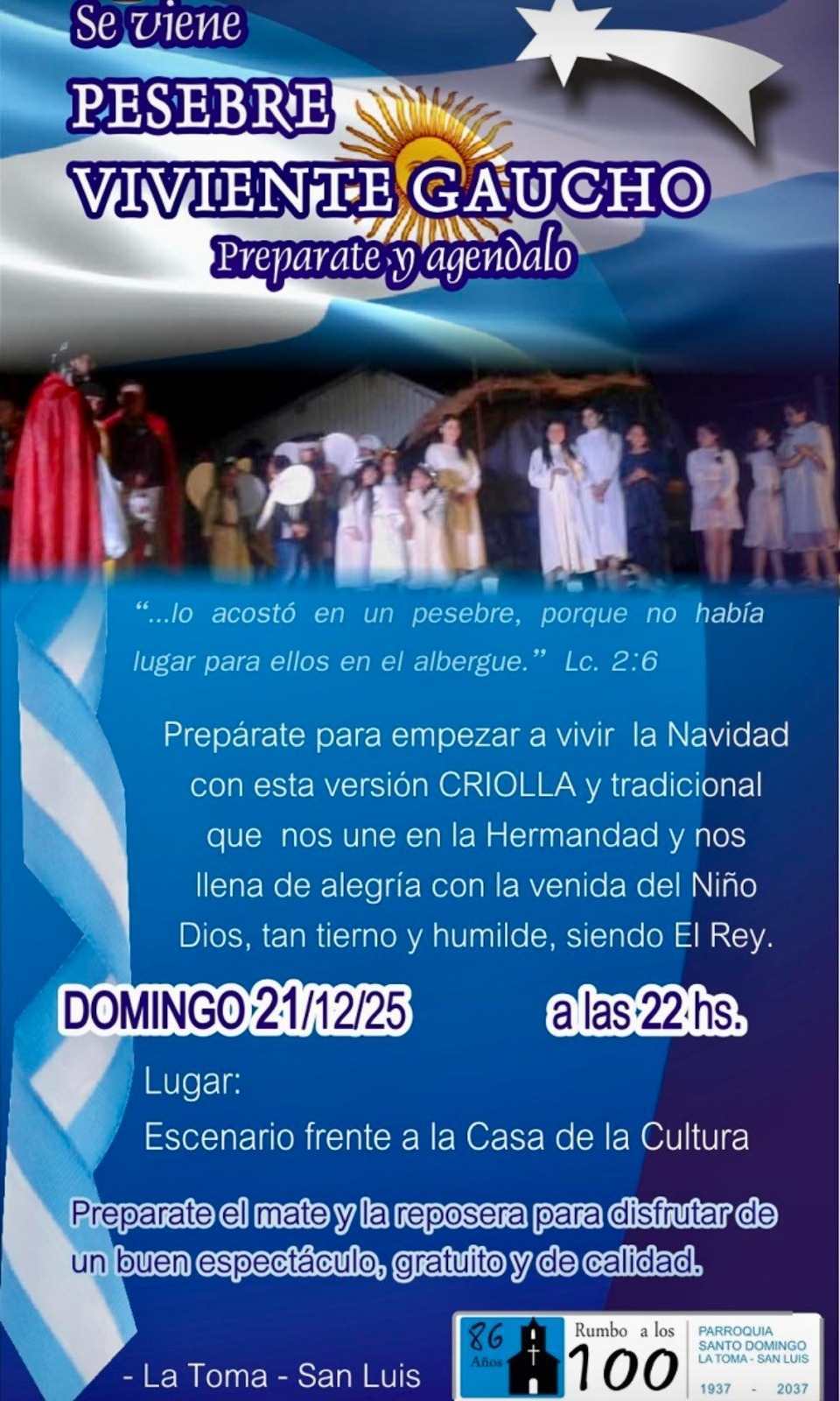 Por su parte, el Pesebre Viviente Gaucho suma una impronta criolla y profundamente identitaria en La Toma. Esta versión tradicional, que fusiona el nacimiento de Jesús con elementos de la cultura rural argentina, se presentará el domingo 21 a las 22:00 en el escenario frente a la Casa de la Cultura.