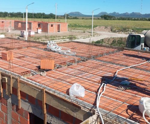 La dirección de Obras de Arquitectura y Viviendas informó que ya se concretó el hormigonado de losas en seis unidades, mientras que en las restantes se progresa con el armado de losas de viguetas pretensadas y el encofrado de vigas de encadenado superior. En paralelo, se trabaja en la colocación de escuadras, caños de ventilación, cañerías de agua fría y señales débiles.