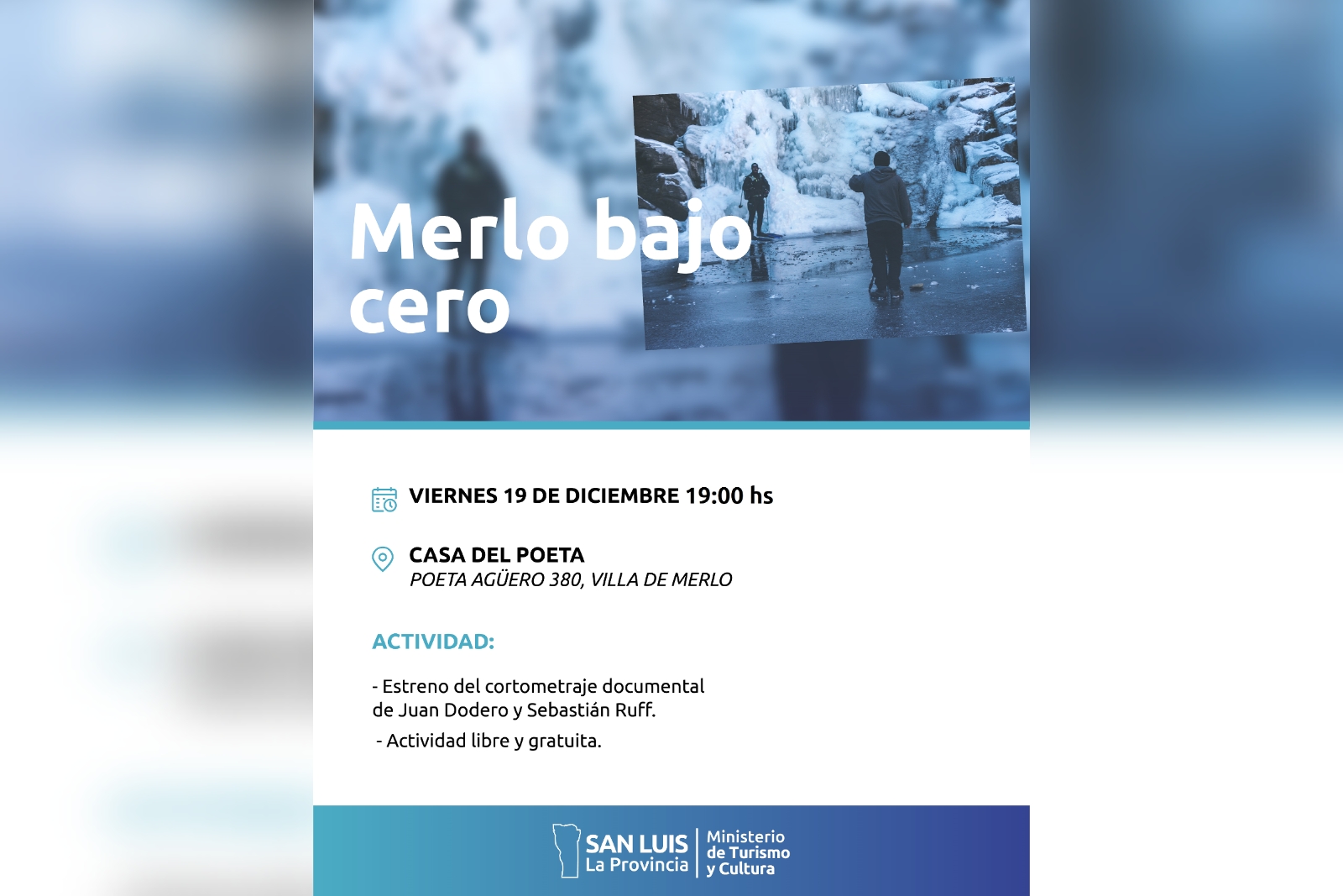 Este viernes 19, el público que concurra a la Casa del Poeta ‘Antonio Esteban Agüero’ de la Villa de Merlo podrá disfrutar del gran estreno del documental ‘Merlo Bajo Cero’. La pieza fue ideada y realizada por Juan Dodero y Sebastián Ruff, a través de su productora Ruff Diving. La función iniciará a las 19:00, con entrada libre y gratuita.
