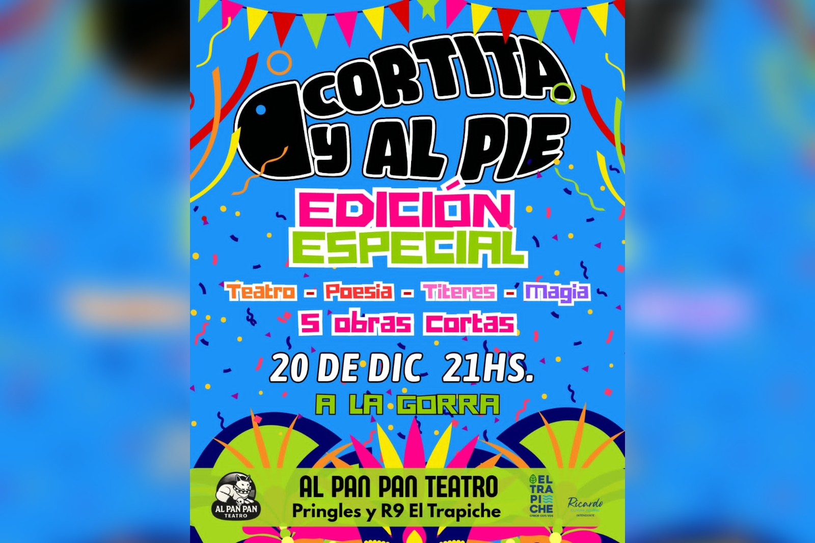 Este sábado 20, a las 21:00, el ciclo teatral ‘Cortita y al Pie’ presentará una edición especial en el espacio cultural Al Pan Pan Teatro de El Trapiche. El evento marca un momento singular dentro del proyecto, que se viene realizando de manera sostenida y exclusiva en la Ciudad de San Luis, con gran concurrencia de público en cada una de sus ediciones.