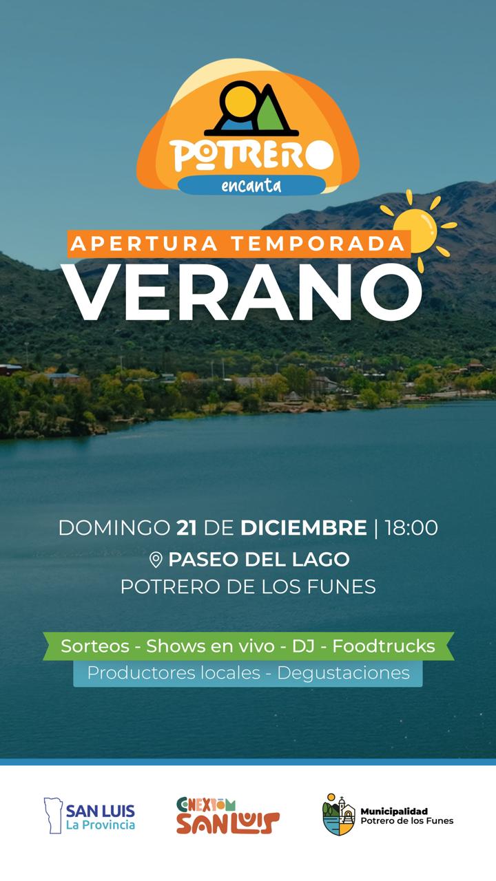 Potrero de los Funes realizará la apertura de la temporada de verano el domingo 21 a partir las 18:00 en el Mirador de las Banderas (Paseo del Lago) a todo ritmo y color: habrá shows en vivo, DJs, degustaciones y feria de emprendedores y productores locales.