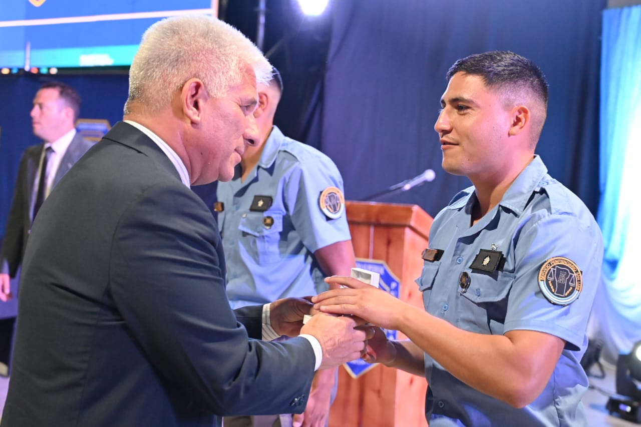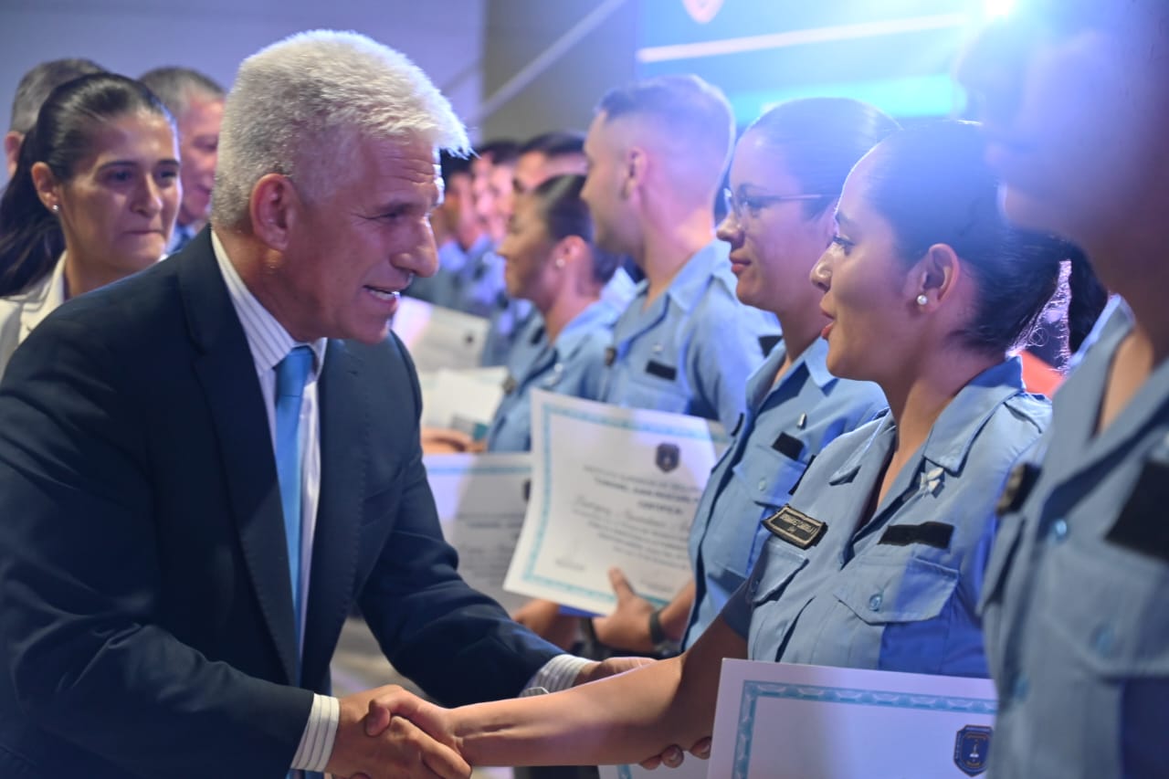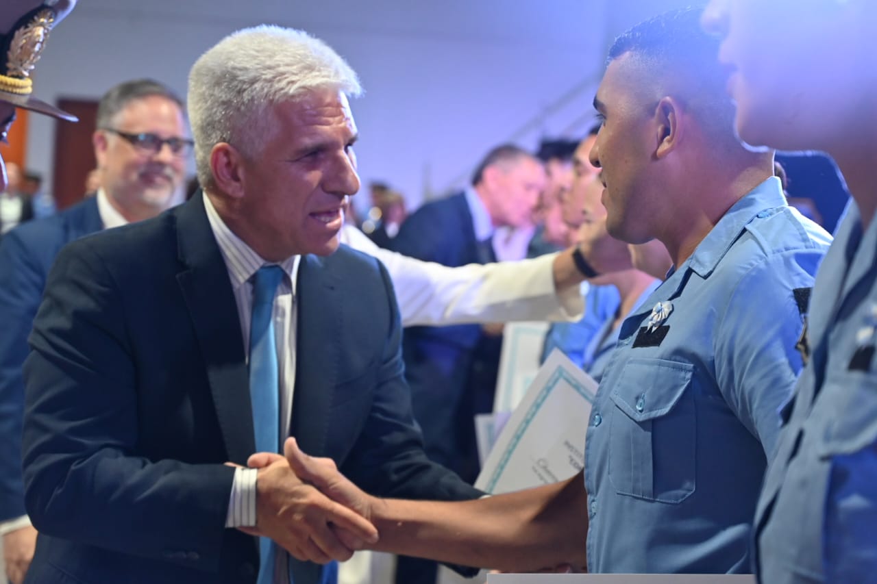 El gobernador Claudio Poggi encabezó el acto de egreso de 115 agentes de seguridad, entre orientación policial y penitenciaria, quienes recibieron sus decretos de designación para comenzar a prestar servicio a partir del 1° de enero de 2026. En su discurso, el Mandatario provincial tomó como ejemplo a la ministro de Seguridad, Nancy Sosa, quien hace 25 años se encontraba en la misma situación que los flamantes egresados. “Hace 25 años, algunos de ustedes habían nacido, otros tenían 2 años, 1 año, 3 años, 4. Nancy estaba sentada ahí, con emoción, esperando el título, y hoy es nuestra Ministro de Seguridad. Es un ejemplo a seguir”, expresó Poggi, destacando la trayectoria de la funcionaria que hoy lidera las políticas de seguridad provincial. “Ella me está ayudando con toda la energía, con toda la experiencia, con toda su carrera íntegra, honesta, profesional, a jerarquizar el instituto de formación en seguridad pública, la institución policial, la institución penitenciaria y llevar adelante múltiples políticas de seguridad en una lucha cuerpo a cuerpo contra el delito”.