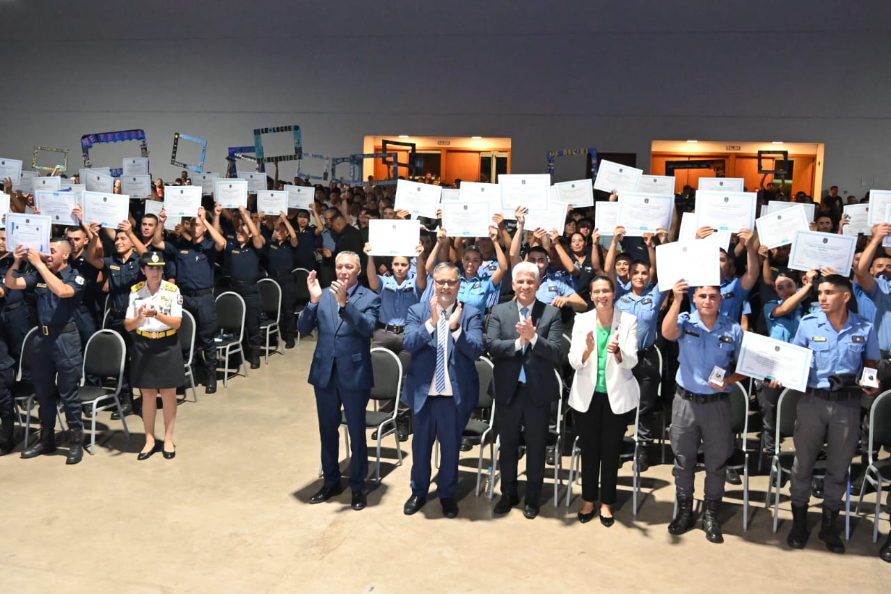 Este viernes, tras su visita a Los Manantiales, el gobernador Claudio Poggi acudió al Centro de Convenciones de La Punta para entregar, junto a la ministro de Seguridad, Nancy Sosa, los certificados que formalizan el egreso del Instituto Superior de Seguridad Pública (ISSP) ‘Coronel Juan Pascual Pringles’ de 82 agentes de la policía y 33 agentes penitenciarios. Del solemne acto también participó el vicegobernador Ricardo Endeiza y el rector del Instituto, Gerardo Velázquez.