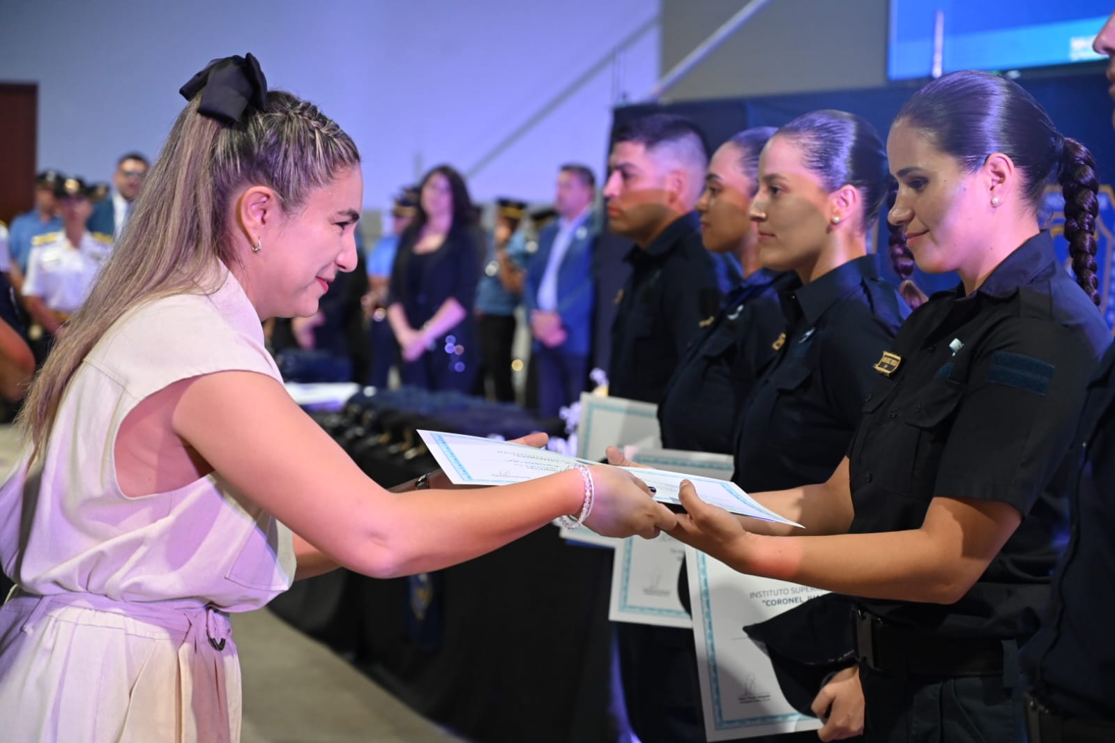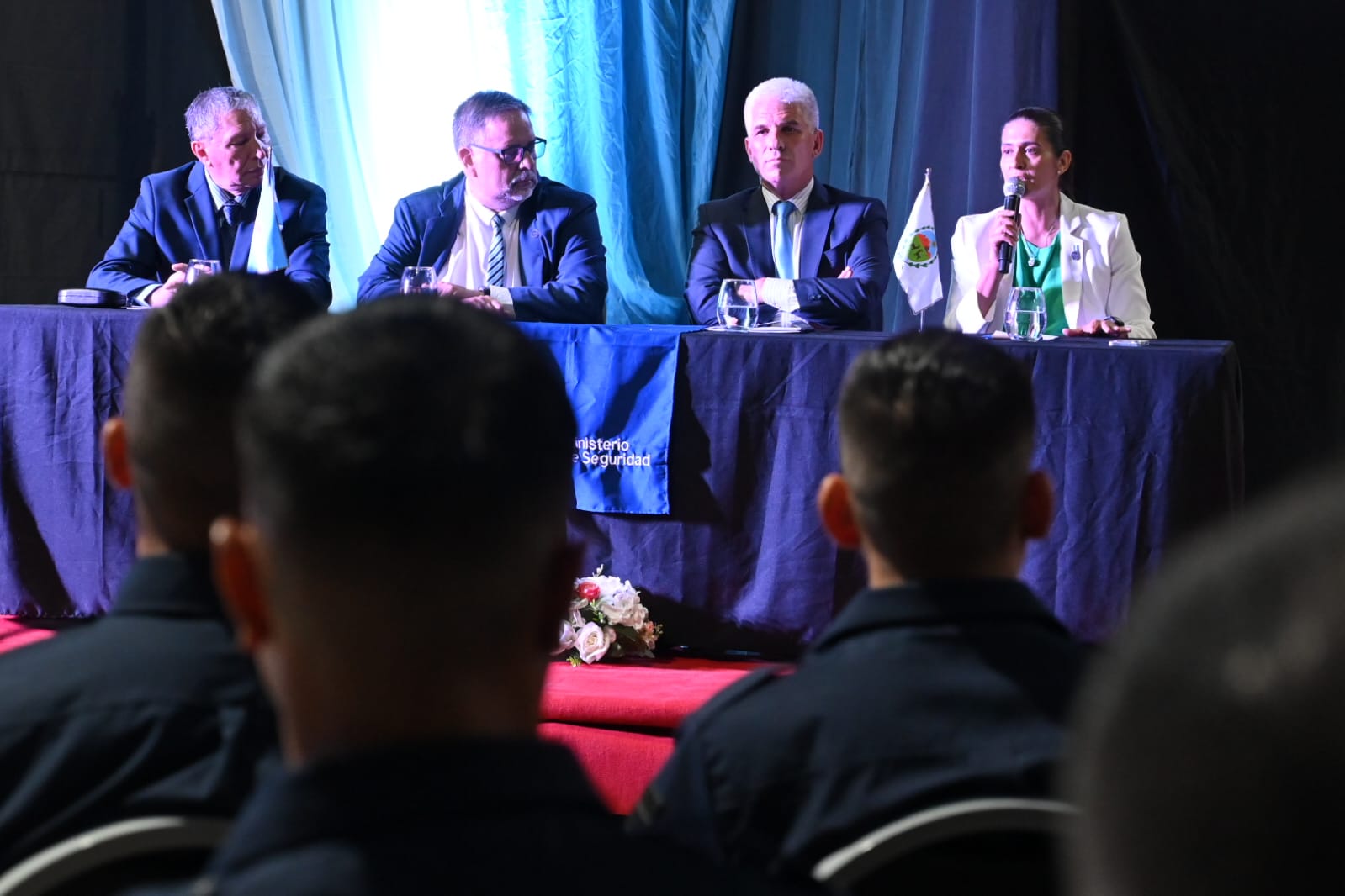 La ministro de Seguridad, Nancy Sosa, tomó la palabra para hacer una serie de punteos que detallan el progreso que han logrado la gestión en materia de infraestructura y mejora de las condiciones para los servidores públicos. “Los ejes centrales del ministerio de Seguridad tienen que ver con la lucha contra la inseguridad y el narcotráfico, pero también con el fortalecimiento institucional del cual ustedes han sido testigos. Pusimos el foco en lo formativo y en esto propiciamos una educación moderna”, explicó y sumó que “además de otorgar una beca para acompañar su proceso, la semana próxima ustedes también van a estar cobrando un bono especial como ha cobrado la administración pública; por lo cual el Gobernador ha firmado el decreto para que lo tengan en el inicio de su función”.