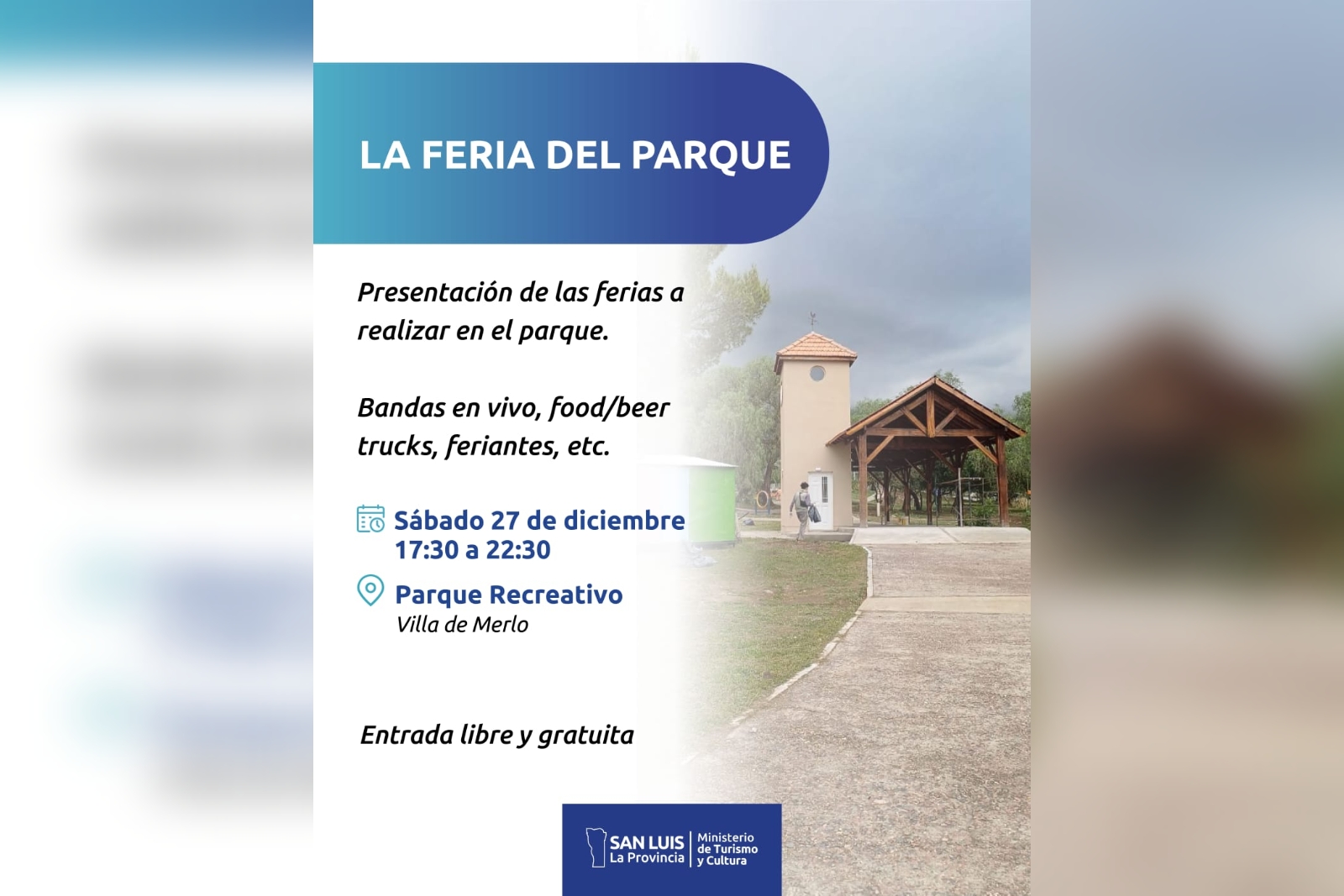 – La Feria del Parque comienza a funcionar este sábado 27 de diciembre. Artesanos, creativos y emprendedores ofrecerán una amplia variedad de productos todos los fines de semanas y feriados desde las 17:30 hasta la puesta del sol.