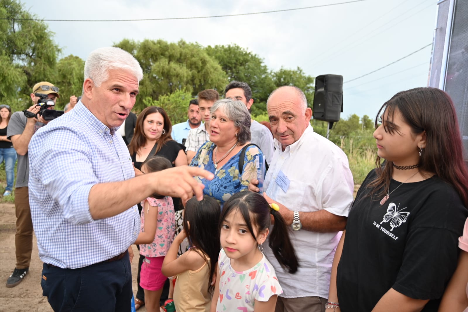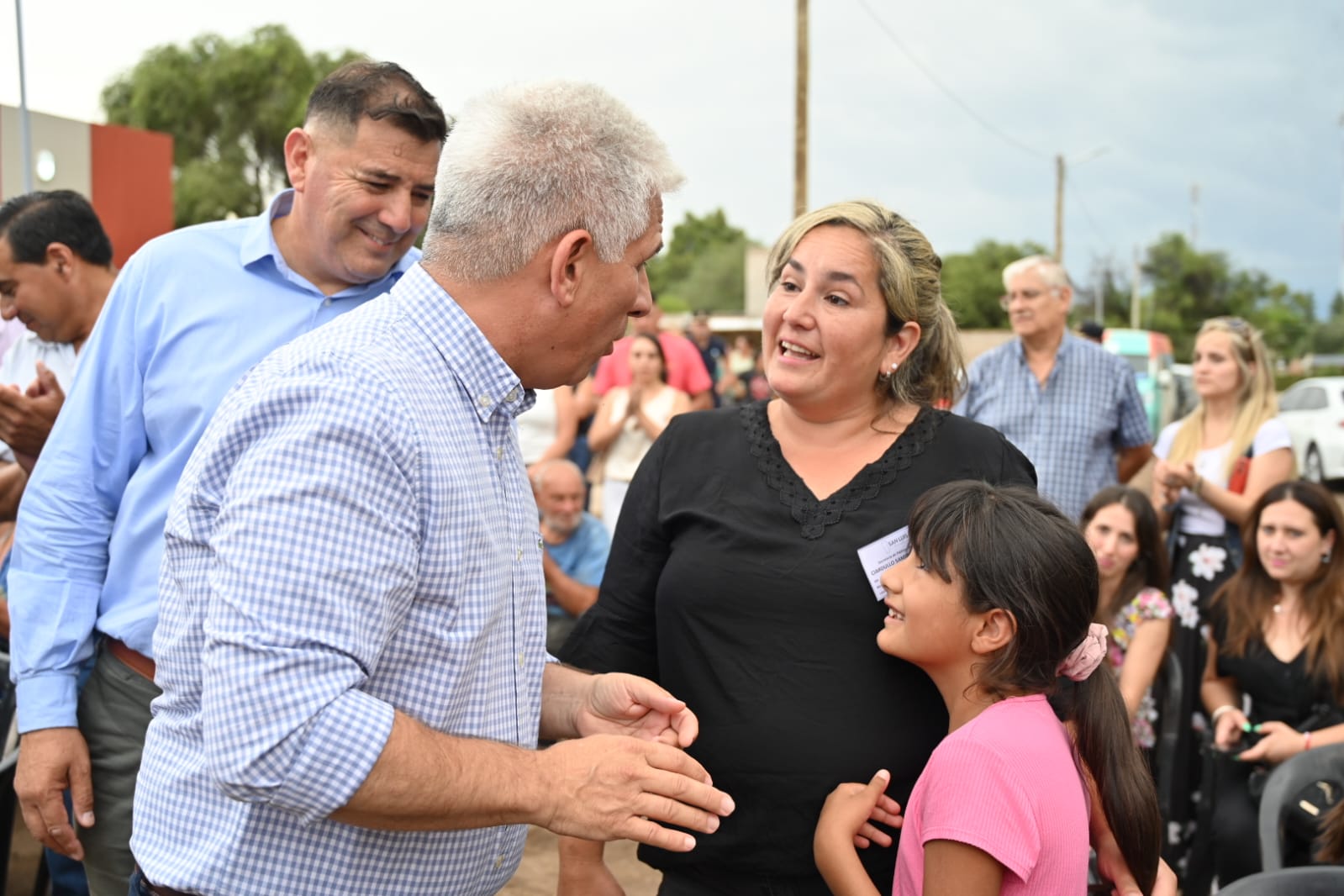 La tormenta que anunciaba su llegada no impidió que el Gobernador recorriera las viviendas y conversara con los adjudicatarios y los vecinos que se acercaron al acto. La actividad finalizó con la entrega de dos tortas que obsequió la Municipalidad a las familias que hoy estrenarán sus casas.