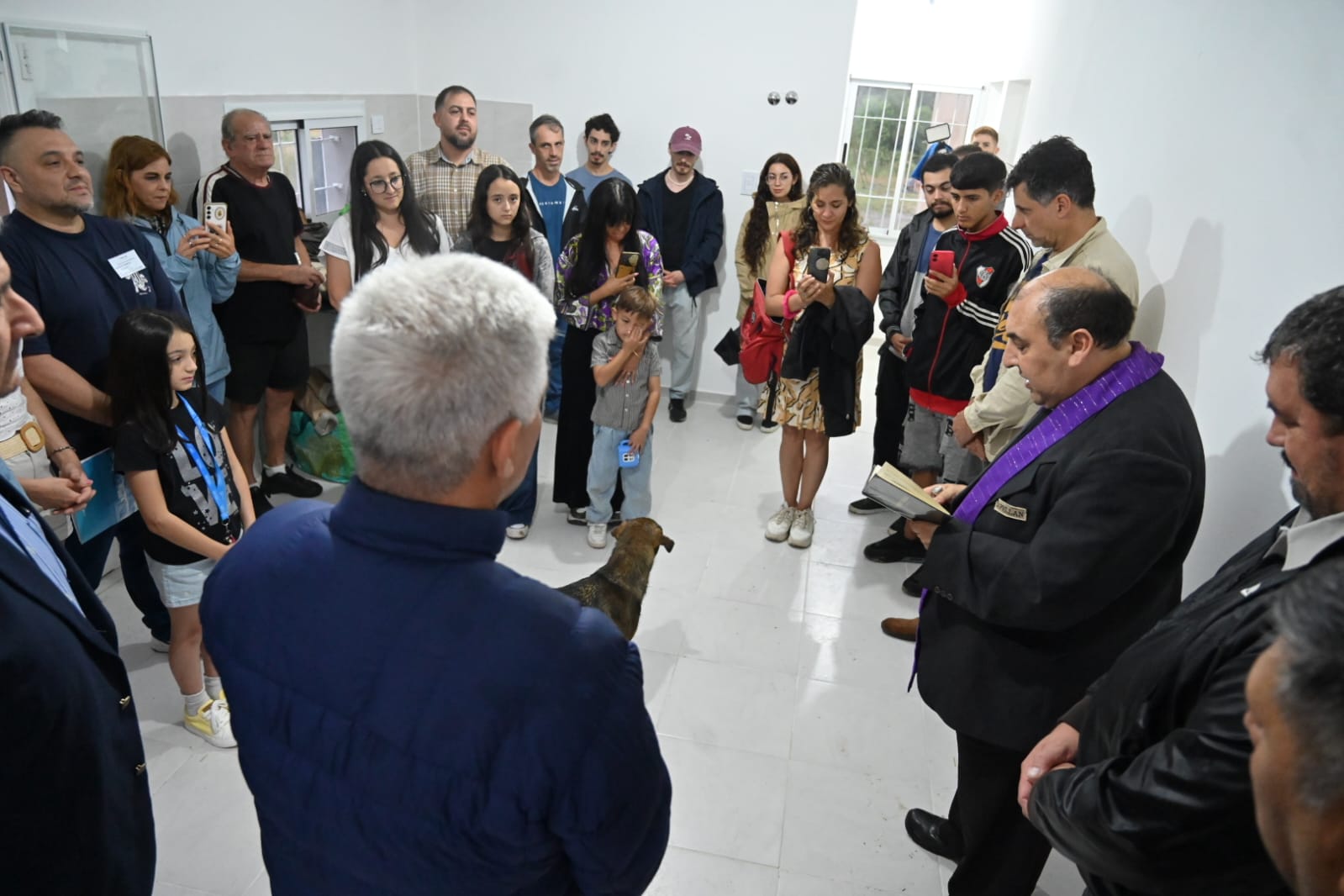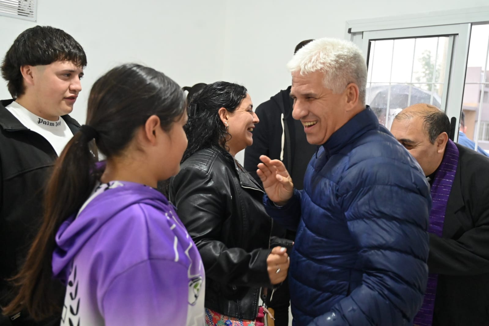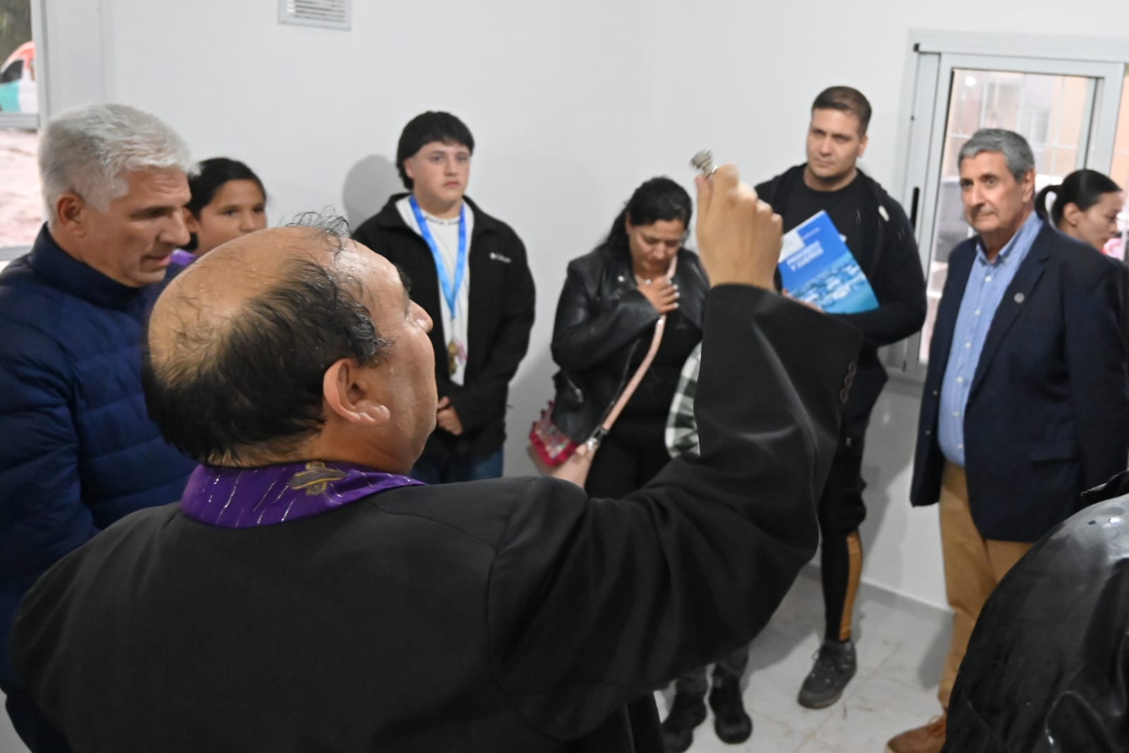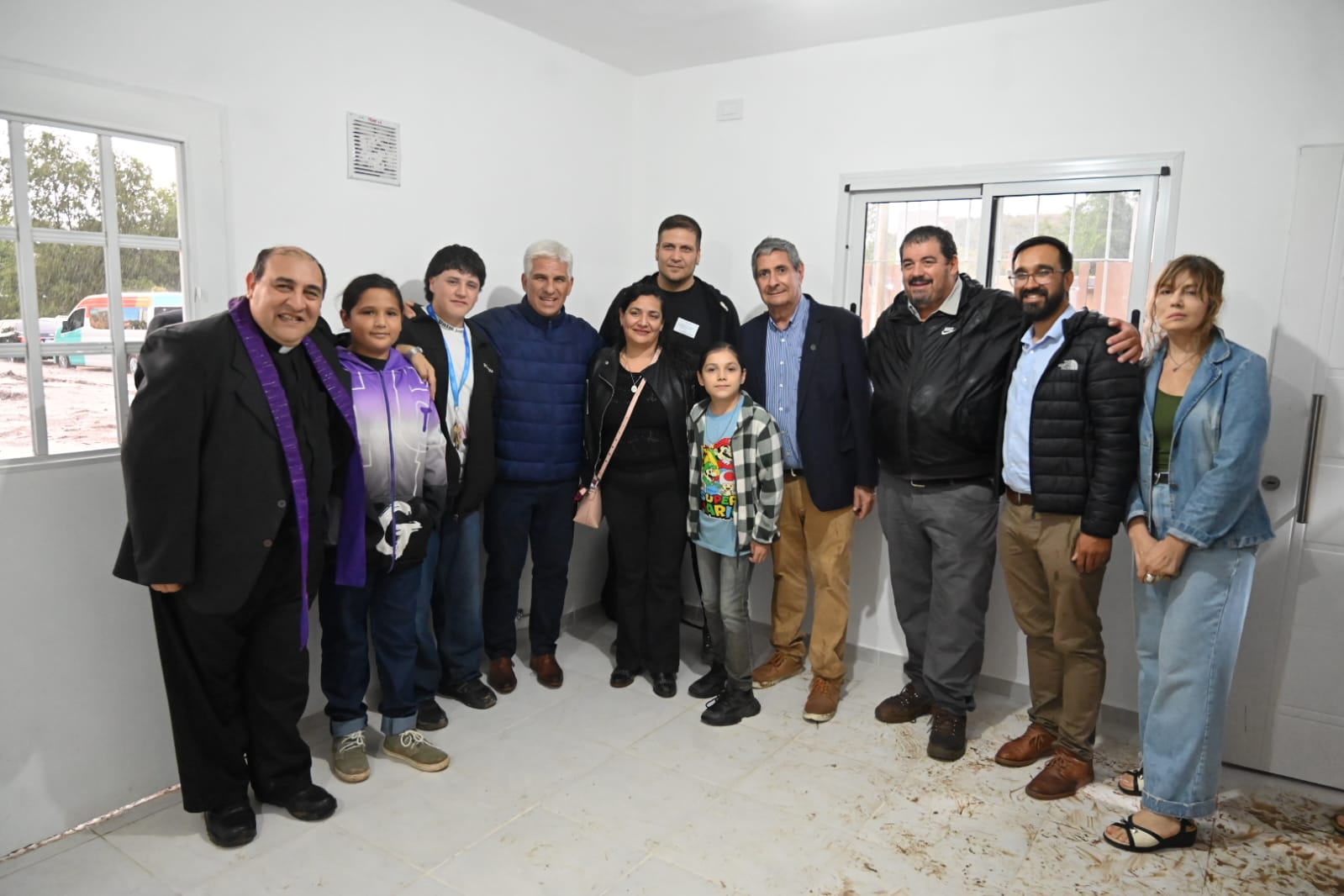 El cielo gris obligó a cambiar la lógica del acto. No hubo discursos extensos ni una ceremonia tradicional. Hubo puertas que se abrieron, habitaciones que se caminaron despacio y bendiciones dadas en voz baja, dentro de cada hogar. El gobernador Claudio Poggi estuvo con cada familia, sin intermediarios, escuchó, acompañó y entregó las llaves en el mismo lugar donde comenzarán nuevas historias.